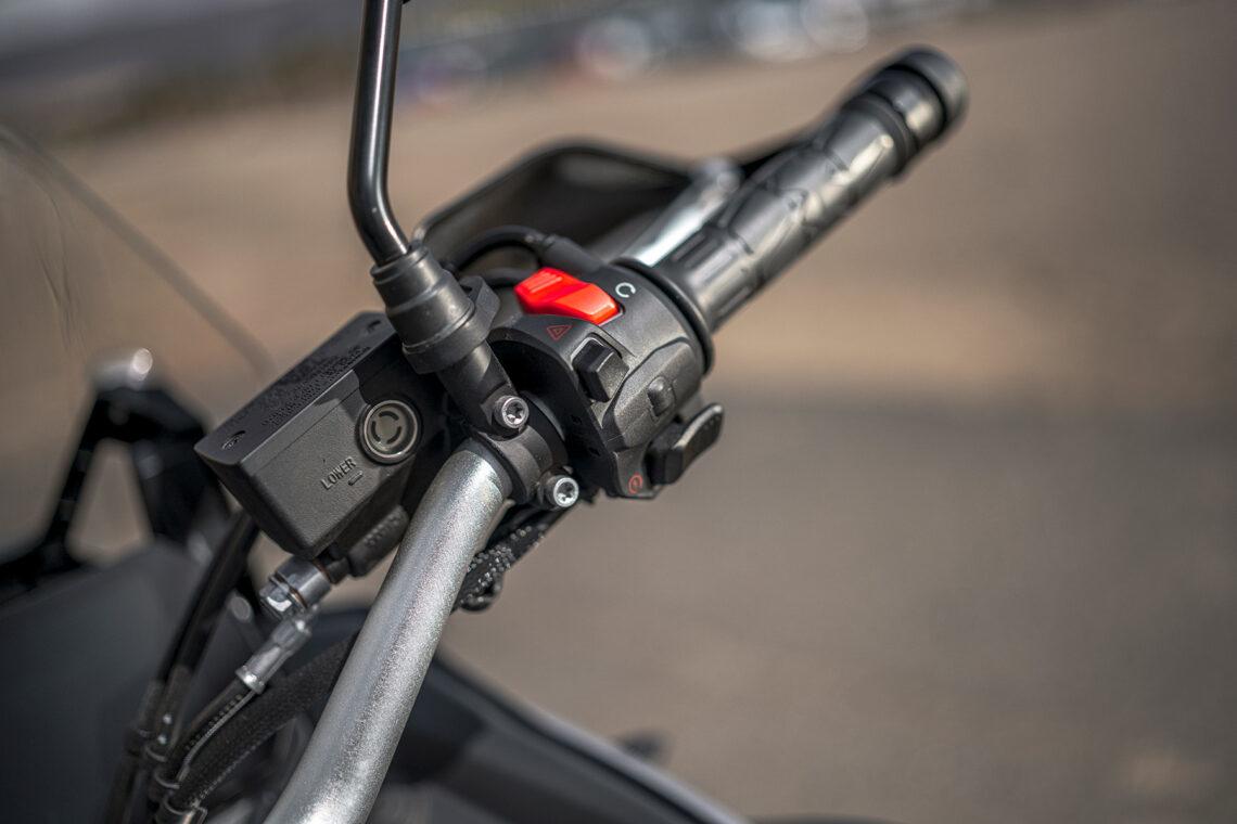 ¡Ahora sí! Nos subimos a ella y sorprende la calidad de sus materiales, como las piñas retroiluminadas. La primera sensación es que es una moto voluminosa en la parte delantera, en gran parte gracias a su depósito de 21 litros. El asiento está bastante bien, pero se nota que lo han rebajado para que sea una moto más accesible. Esto supone que las piernas vayan más flexionadas y ganes control sobre el suelo, pero pierde en mullido y comodidad. Como decía, da sensación de ir algo encajonado aunque ciertamente cómodo. Puede que el manillar resulte un poco alejado para usuarios más bajos, pero es cuestión de ajustar su inclinación.