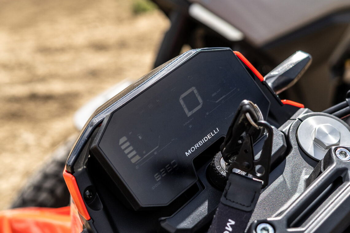 Y vamos con la Morbidelli T502X. Tiene la misma configuración bicilíndrica, aunque ya crece hasta los 486 cc, lo que le permite alcanzar holgadamente los casi 47 cv de potencia máxima para el carnet A2, lo cual se nota en su forma de entrega de potencia más contundente y capaz, aunque también con gran suavidad y una actitud muy similar a la '352'. En su parte ciclo, monta horquilla de 41 mm, pero con un recorrido menor, 150 mm, mientras que el monoamortiguador con ajuste de precarga y y bieletas. El concepto es muy similar, con llantas de radios y gomas tubeless de 19" y 17", respectivamente y frenos que ascienden a un doble disco de 300 mm delante con un disco de 240 mm detrás y pinzas firmadas por JJuan, mejor dotación para detener los 210 kg de peso en orden de marcha. En este caso, curiosamente, dispone de sólo 2 modos de conducción: Sport y Off-road. El concepto es el mismo, desactivando las ayudas para el modo campero, y también la crítica, ya que tampoco se pueden cambiar durante la marcha.