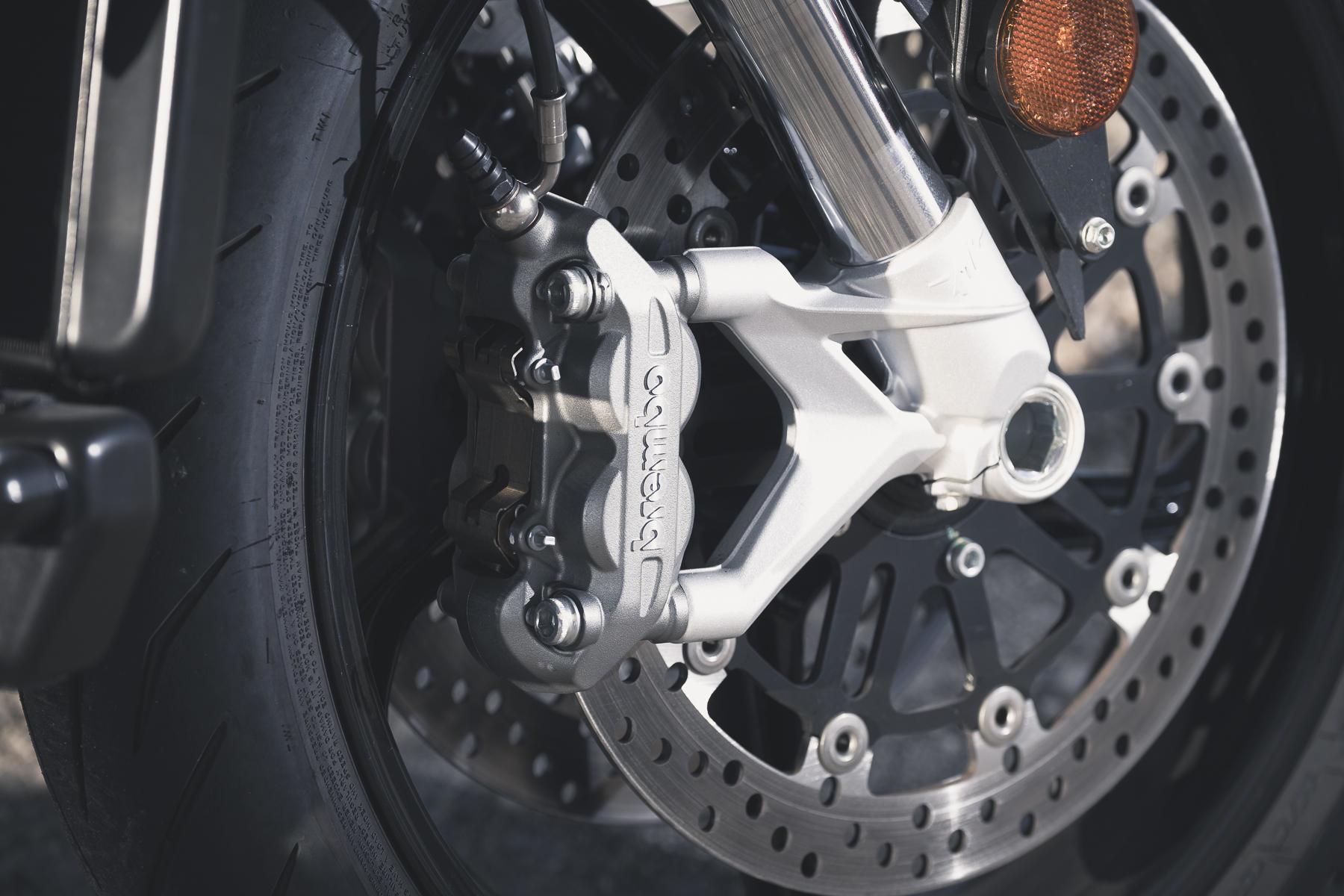 La frenada de la MV Agusta Brutale 800 A2 es otro punto muy destacable, evidentemente es una moto muy ligera que va con la potencia reducida casi hasta la mitad, por lo que no podremos coger tanta velocidad y, el conjunto es muy ligero. Eso evidentemente se traduce en una frenada espectacular, pero es que además el tacto que otorgan los componentes Brembo es directo, terso y deportivo. Quizá el freno trasero si es algo más flojo, pero eso se debe a su geometría, que carga bastante sobre el tren delantero.