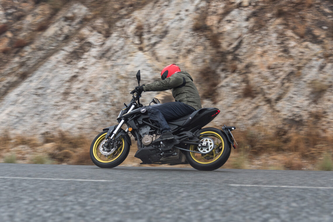 Las suspensiones nos parecieron en su sitio y un reglaje de fábrica bastante acertado, con más tiempo y para nuestro peso quizá habría aumentado un poco la precarga detrás, pero la horquilla se encargó en todo momento de transmitir buenas sensaciones y de absorber las irregularidades con nobleza, algo fundamental y de vital importancia cuando te fías poco del asfalto. Y a estas alturas te preguntarás ¿y los neumáticos? Eso fue lo primero que preguntamos sobre la moto cuando vimos el pronóstico del tiempo, y la respuesta fue tan buena como el resultado obtenido: Maxxis. QJ ha optado por montar unos neumáticos de calidad que nos han permitido disfrutar con seguridad bajo la lluvia. Con un 110 delante y un 150 detrás nos hemos movido con agilidad, confianza y aplomo en todo momento.