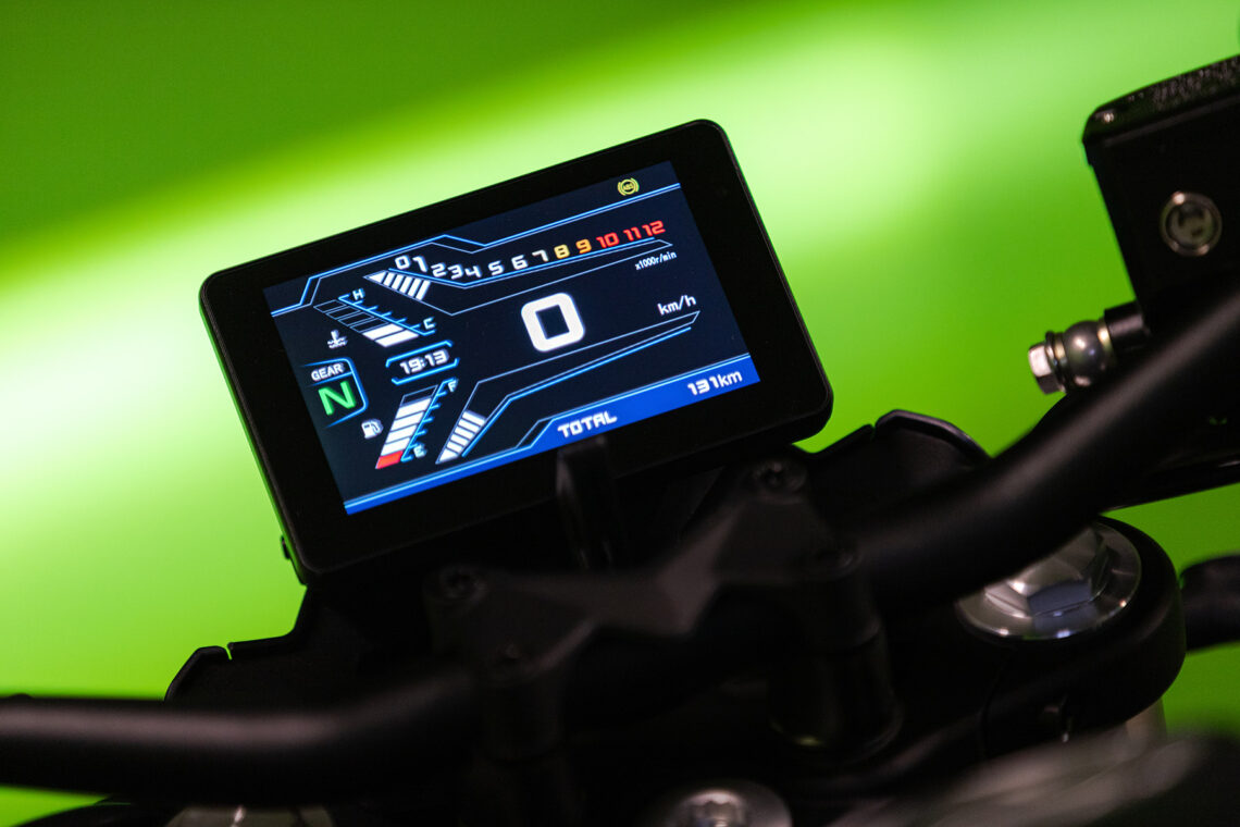 QJ ha querido cuidar especialmente el equipamiento de su SRK y la ha equipado con varios detalles de calidad. Por ejemplo, su instrumentación merece una mención aparte. Una pantalla TFT de 5” de diseño atractivo en el que vemos toda la información de un vistazo, y que ofrece dos tonalidades, una con fondo blanco y otra con fondo negro. Podemos elegir cuál poner o dejar que la moto la cambie automáticamente. En un día con poca luz como el nuestro, la pantalla cambiaba constantemente porque las nubes no se lo ponían fácil, y resultó más cómodo prefijar nosotros la tonalidad deseada. Además ofrece conectividad por Bluetooth, aunque al usuario solo le servirá para recibir notificaciones de llamadas, pero no para contestarlas, por lo que resulta más útil para el diagnóstico de la moto que para otra cosa. Otro buen detalle son las piñas de conmutadores retroiluminadas, pocas motos ofrecen eso, y menos una naked A2 de precio ajustado. Y ojo, aquí donde la ves la SRK 400 está preparada para equipar sensores de presión de los neumáticos, aunque la marca lo ofrezca como un extra opcional.