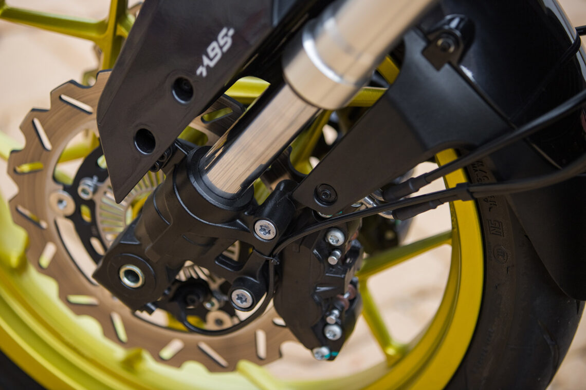 Este motor cuelga de un chasis multitubular de acero, del que parte directamente un amortiguador trasero inclinado y ubicado en el lado derecho, hasta unirse con un basculante igualmente tubular. Este elemento trasero ofrece regulación tanto en precarga como en extensión, mientras que delante lo que encontramos es una horquilla invertida de 125 mm de recorrido, en este caso sin posibilidad de regulación. La parte ciclo la completa un equipo de frenos bien servido, con un doble disco delantero lobulado de 260 mm y pinzas de dos pistones, más otro trasero de 240 con pinza de simple pistón. Con todos estos datos sobre la mesa, ya solo nos quedaba ponernos a sus mandos y ver cómo se compenetran todos los componentes y cómo se defienden sobre el asfalto.