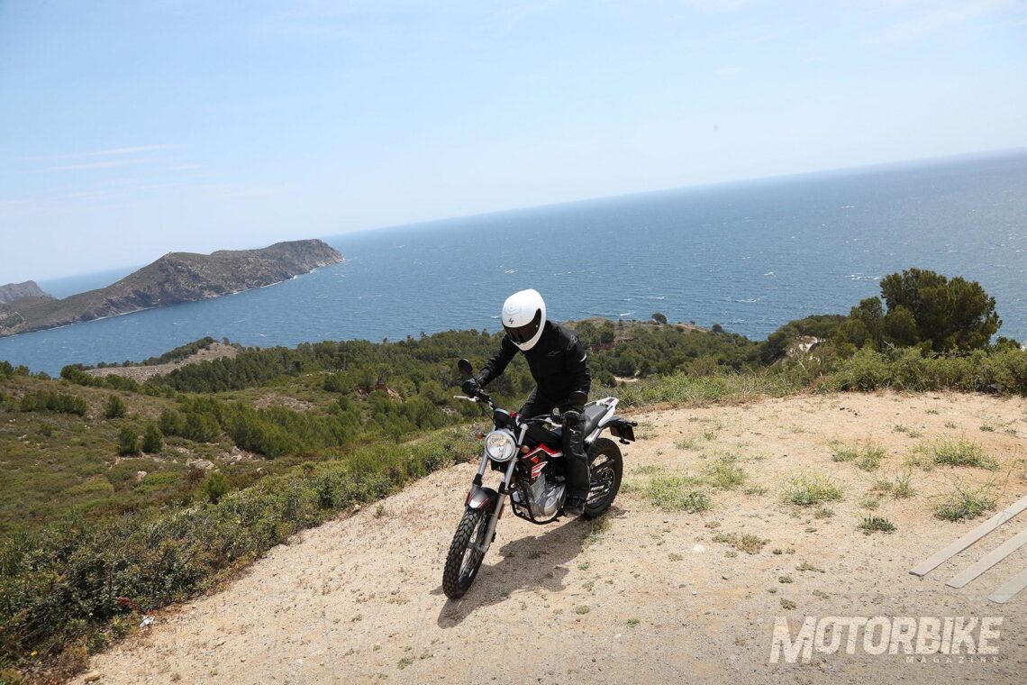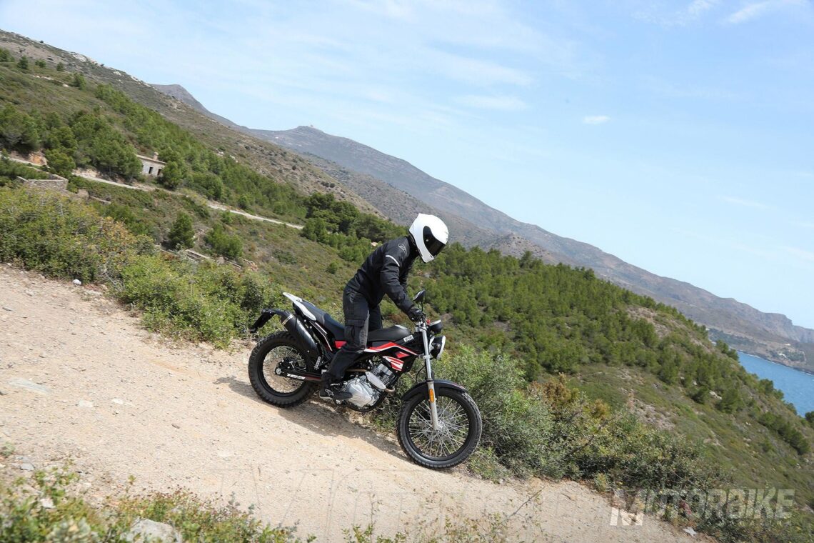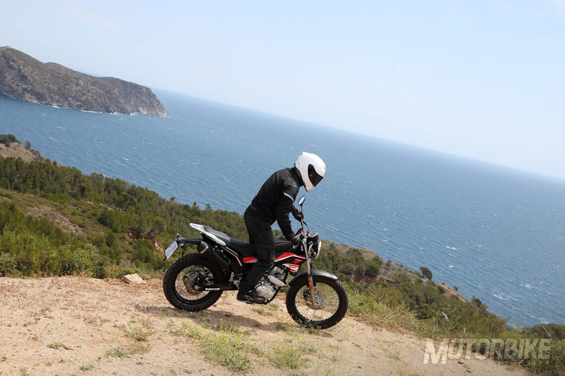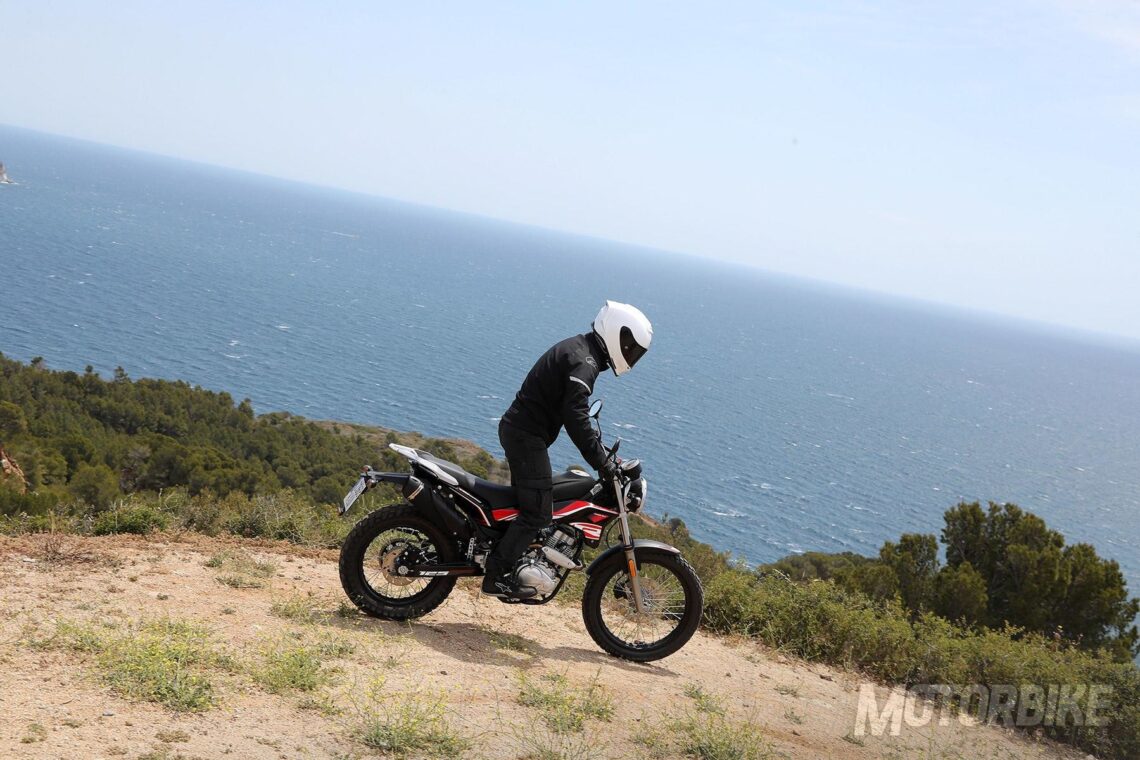 En carretera de montaña, pudimos apreciar muchas de sus bondades, a pesar de que en este caso son los neumáticos los menos indicados. Subimos a la sierra del Cap Norfeu, una carretera estrecha, lenta y revirada. La Rieju Tango 125 es extremadamente ágil, en curvas lentas y medias es una gozada, disfrutas muchísimo, la escasa potencia te permite jugar sin miedo, pasártelo bien. En muchas ocasiones he reconocido que es más divertido una moto con poca potencia y poco peso que una moto más potente y pesada. Este es uno de ellos, se trata de una moto sencilla pero muy divertida. Todo hay que decirlo, este exceso de agilidad puede volverse contraproducente mostrando un poco de inestabilidad en alta velocidad o en virajes muy rápidos, pero lo cierto es que en velocidades normales, no se manifiesta ninguna inestabilidad. Seguramente los neumáticos también tengan algo que ver, y con un modelo más liso la moto gane mucho, pero claro, perderíamos gran parte de su condición offroad que estas cubiertas nos ofrecen.