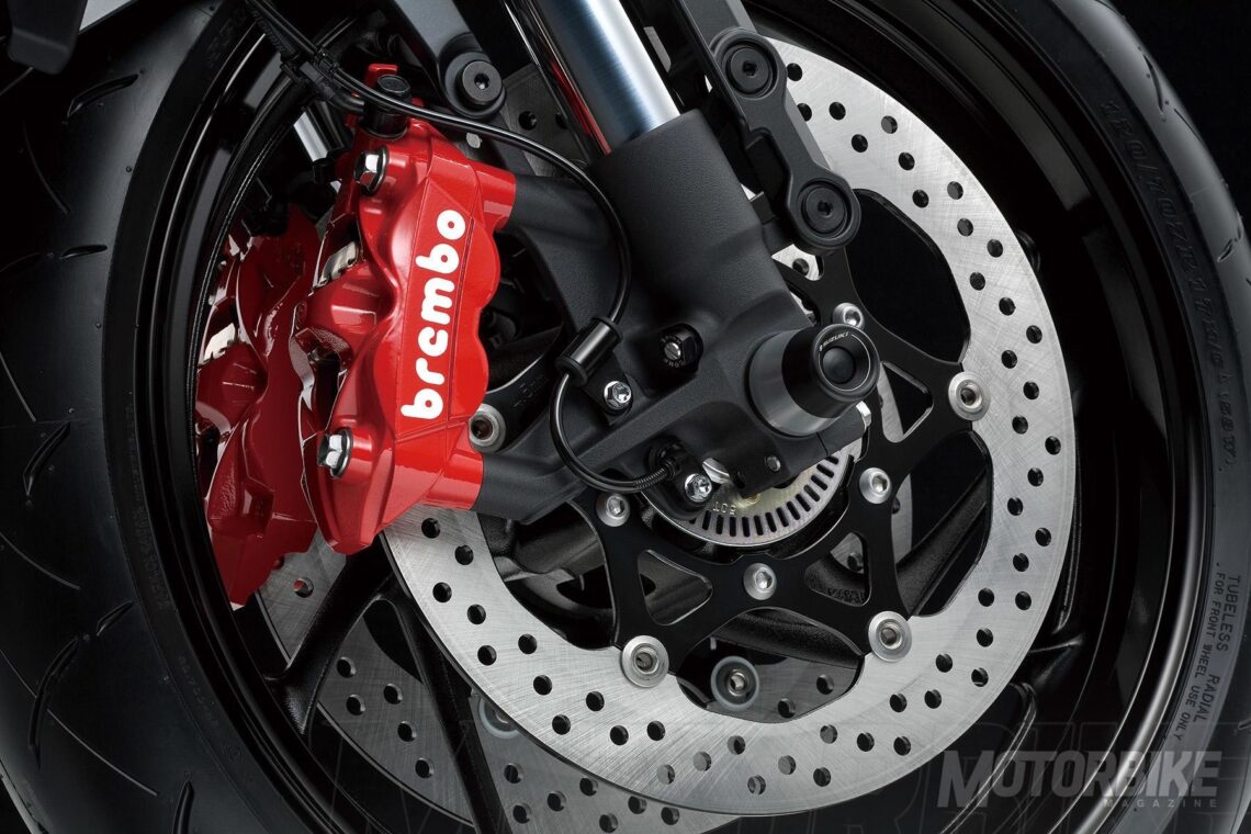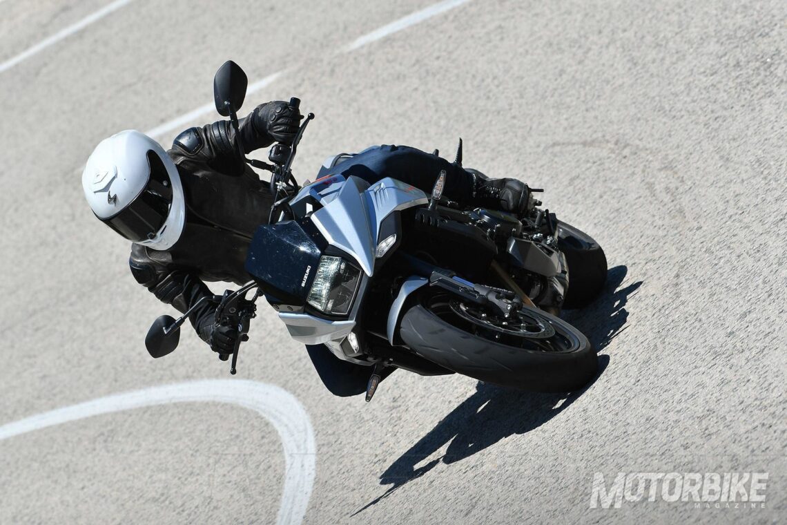 De aquí pasamos directamente al ciclo: estamos ante componentes de alta calidad, que provienen directos de de la GSX-R en algunos casos, como las pinzas de freno Brembo de 4 pistones y los discos de freno de 310 mm. El sistema ABS de Bosch y su nueva unidad de control solo pesa 640 gramos. La suspensión delantera se trata de una horquilla invertida KYB totalmente regulable, de 43 mm de diámetro y 120 mm de recorrido. El amortiguador trasero ofrece un ajuste de precarga en tres posiciones y ajuste de hidráulico en precarga.
