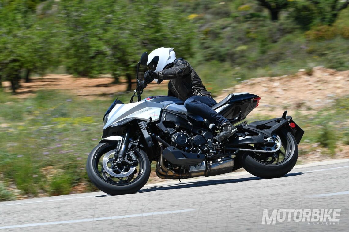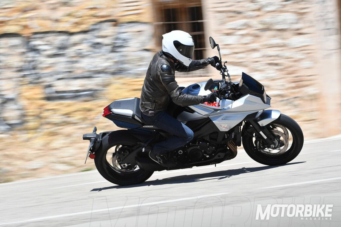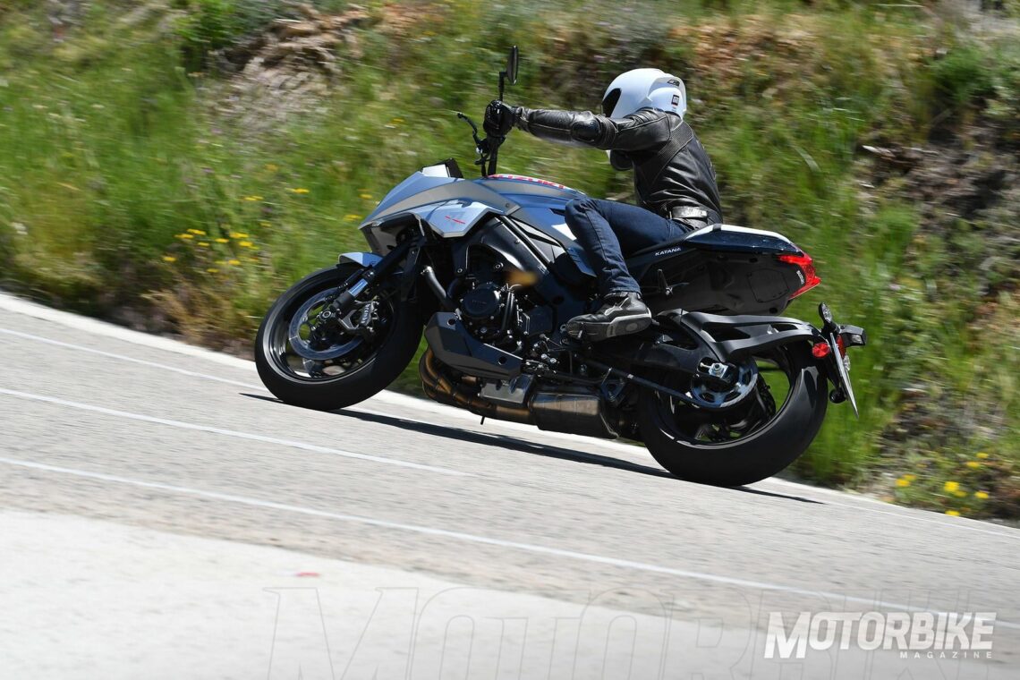 Tras ello, salimos a carretera a probar esta bestia con tanto pasado y legado; la Suzuki Katana 2019. Las primeras impresiones son de moto protuberante, prominente, imponente, implacable, tenaz y agresiva. Una espectacular mezcla de impresiones, que debes aprender a canalizar para subirte a la moto y disfrutar de ella. Una vez rodando, las sensaciones que transmite durante los primeros kilómetros son fuertes, en todos los sentidos; el motor empuja mucho, los frenos muerden mucho, y el manejo resulta duro. No es una moto para juniors. En las primeras curvas sientes la envergadura e inercia de la moto, todo requiere temple. El gas requiere adaptación, los frenos igual y la maniobrabilidad también.