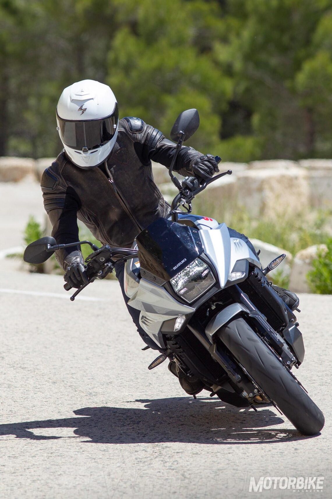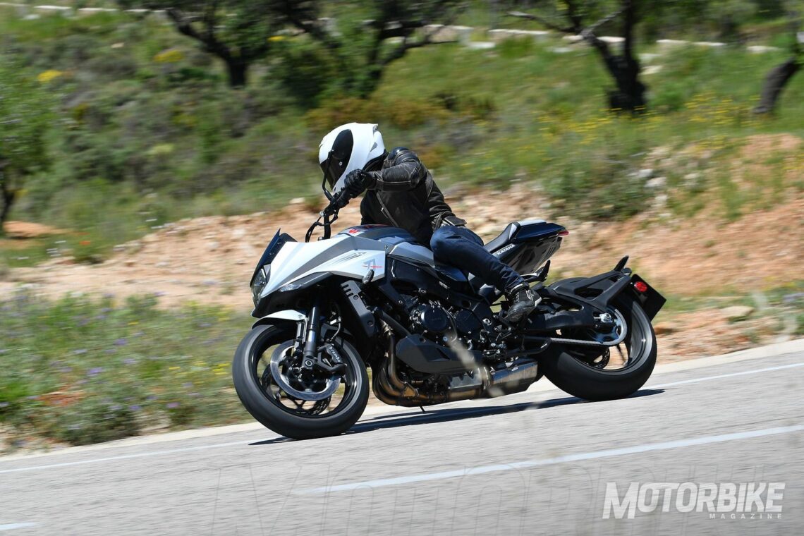 El tramo de curvas por el que circulamos era relativamente revirado, quizá más de lo apropiado para una moto de alta cilindrada. También debo reconocer que había bastantes obras en la carretera y gran parte del asfalto tenía siempre una ligerísima capa de arenilla. Dicho esto apunto que los neumáticos, unos Dunlop Roadsport 2 con una carcasa específica para la Suzuki Katana, no terminaron ser de mi agrado. Seguramente una carretera más abierta hubiera permitido mayor despliegue dinámico y prestacional a esta bestia plateada. Lo mejor de la Suzuki Katana es el aplomo en curva, y la capacidad de tracción para salir catapultado de una curva a otra. La entrada a curva sí percibí un poco más de imprecisión por parte de la rueda delantera. También puede verse afectada por la portentosa capacidad de frenado que tiene la Katana 2019. Las pinzas Brembo heredadas de la GSX-R son un claro acierto, hasta tal punto que debes aprender a regular la gran potencia de frenado que ofrece, ya que muchas veces presionaba con excesiva fuerza la maneta y esto dificultaba a fluidez de mi conducción. Por otro lado, el sistema ABS se mostró muy intrusivo, y eso fue lo que me indicó que el binomio neumático asfalto no estaba en óptimas condiciones, dado que la intrusividad con la que el ABS saltaba no siempre era regular. Esto es un punto positivo hacia el sistema ABS, que a pesar de funcionar con excesiva rapidez para mi gusto, se mostró adaptado a las cambiantes condiciones del asfalto.