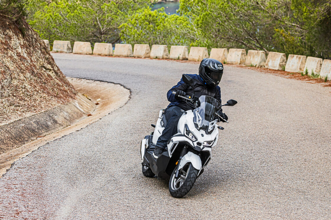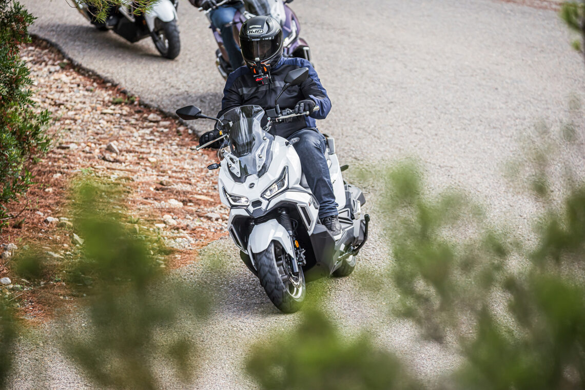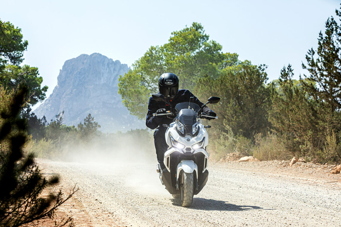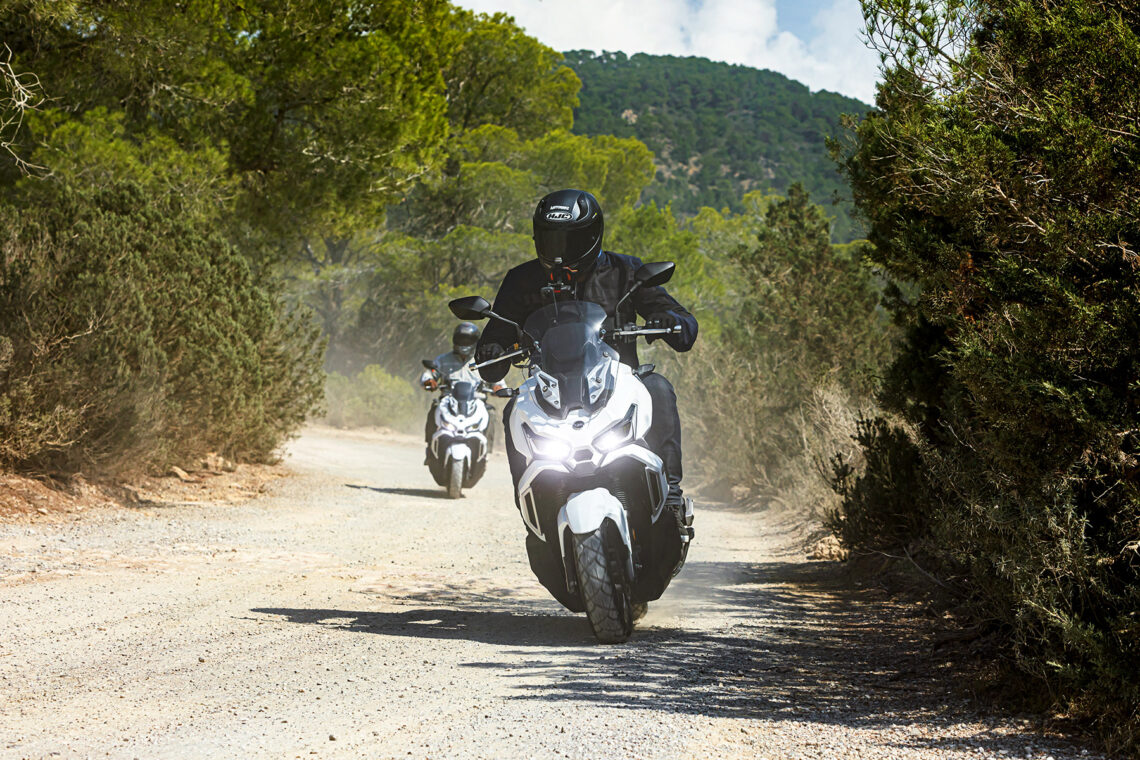 Si hablamos de adentrarnos en pistas de tierra fáciles o caminos, como buen scooter aventurero, el parabrisas queda bajo para ver lo que tienes delante e incluso jugar a ponerte de pie en las secciones más camperas, con un manillar visto que te dará mayor confianza y unos neumáticos mixtos que te ayudarán a sujetar algo más que los habituales lisos. La horquilla tiene un recorrido de 9 cm, mientras que el monoamortiguador sólo de 4.3 cm por lo que cuídate de saltar y "hacer mucho el cabra". Además, el control de tracción es desconectable, ideal para no ralentizarte demasiado en aceleración.