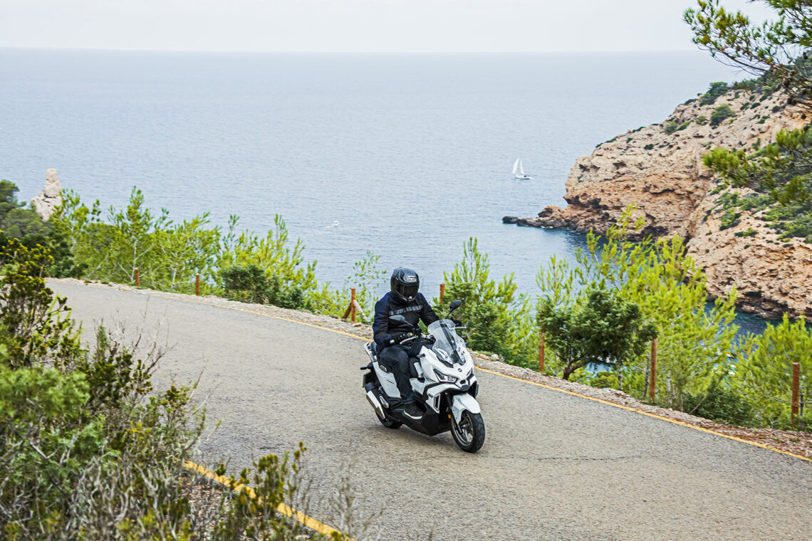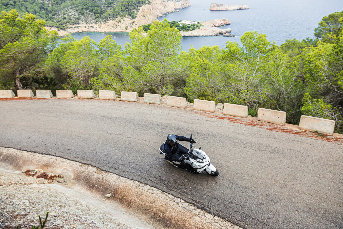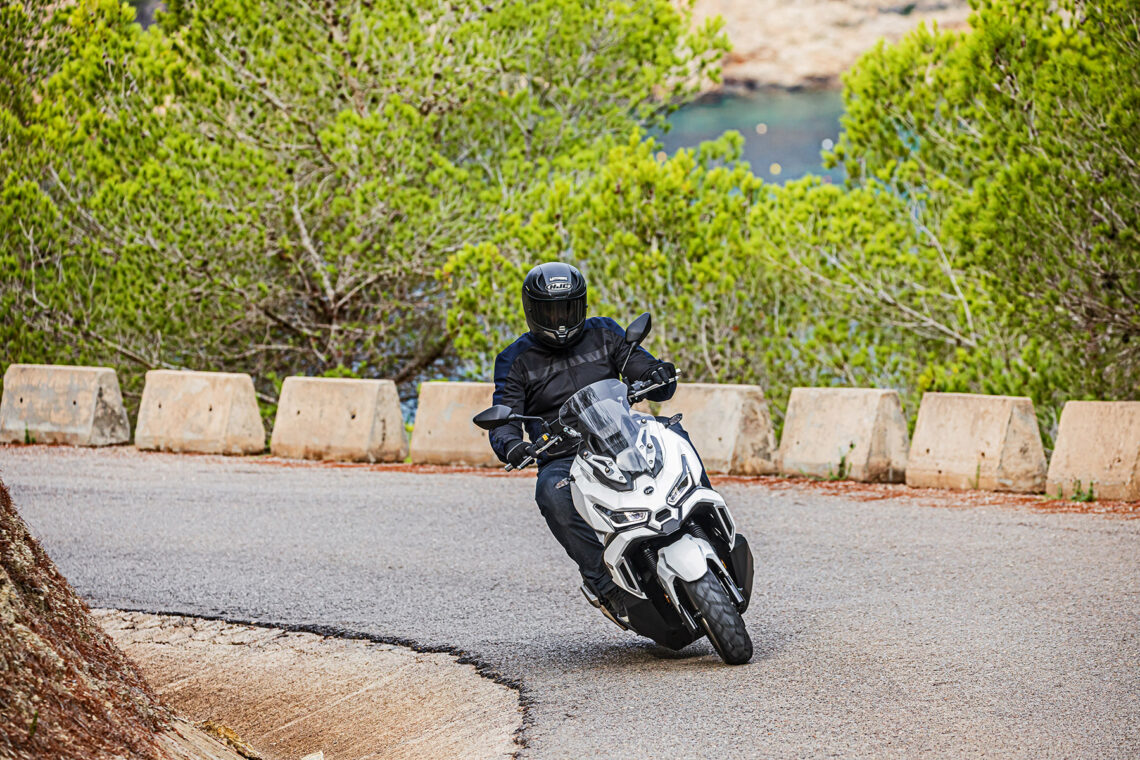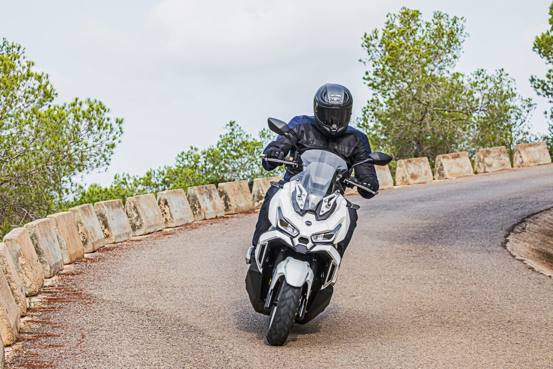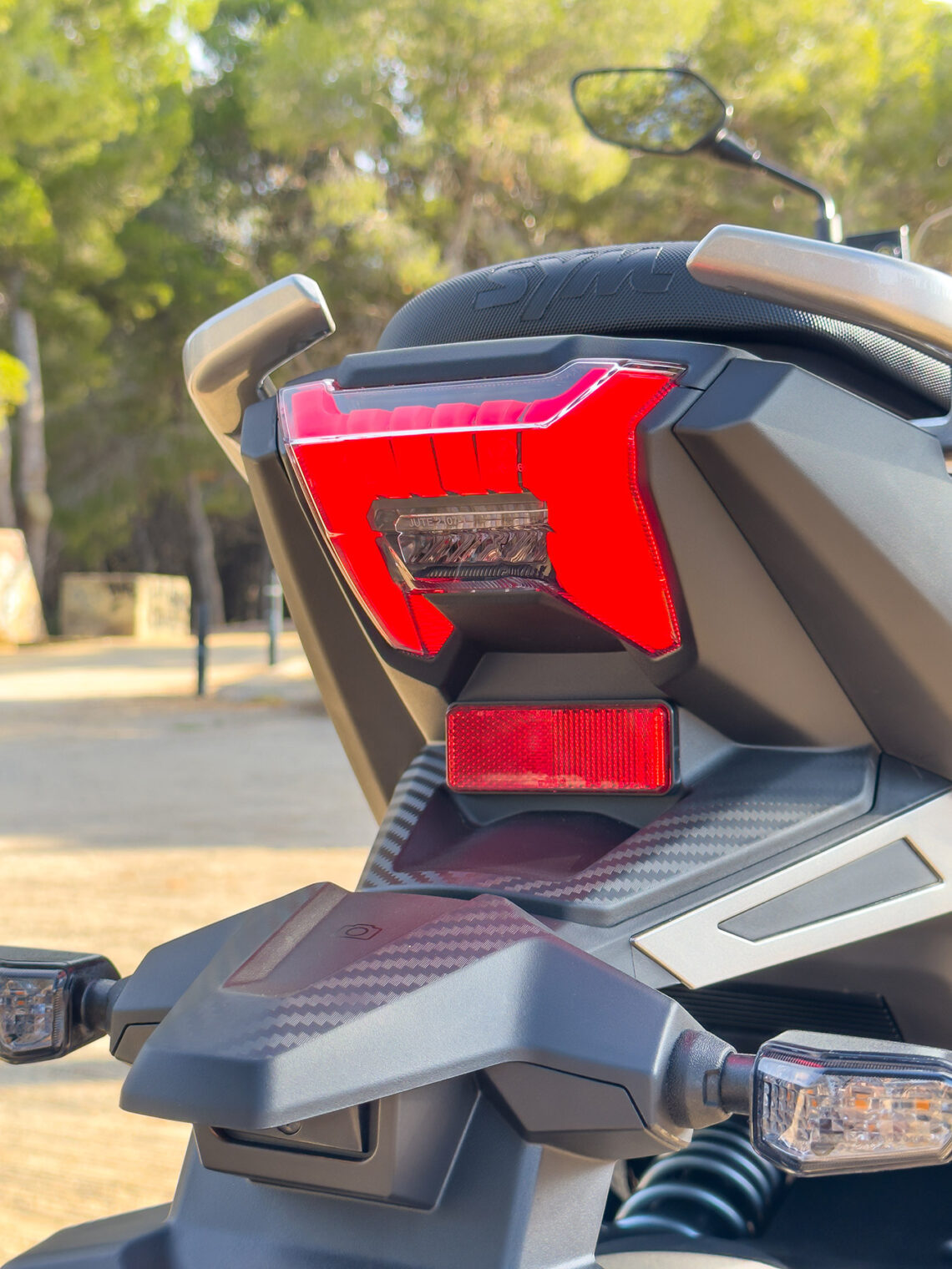 Si hablamos de adentrarnos en pistas de tierra fáciles o caminos, como buen scooter aventurero, el parabrisas queda bajo para ver lo que tienes delante e incluso jugar a ponerte de pie en las secciones más camperas, con un manillar visto que te dará mayor confianza y unos neumáticos mixtos que te ayudarán a sujetar algo más que los habituales lisos. La horquilla tiene un recorrido de 9 cm, mientras que el monoamortiguador sólo de 4.3 cm por lo que cuídate de saltar y "hacer mucho el cabra". Además, el control de tracción es desconectable, ideal para no ralentizarte demasiado en aceleración.