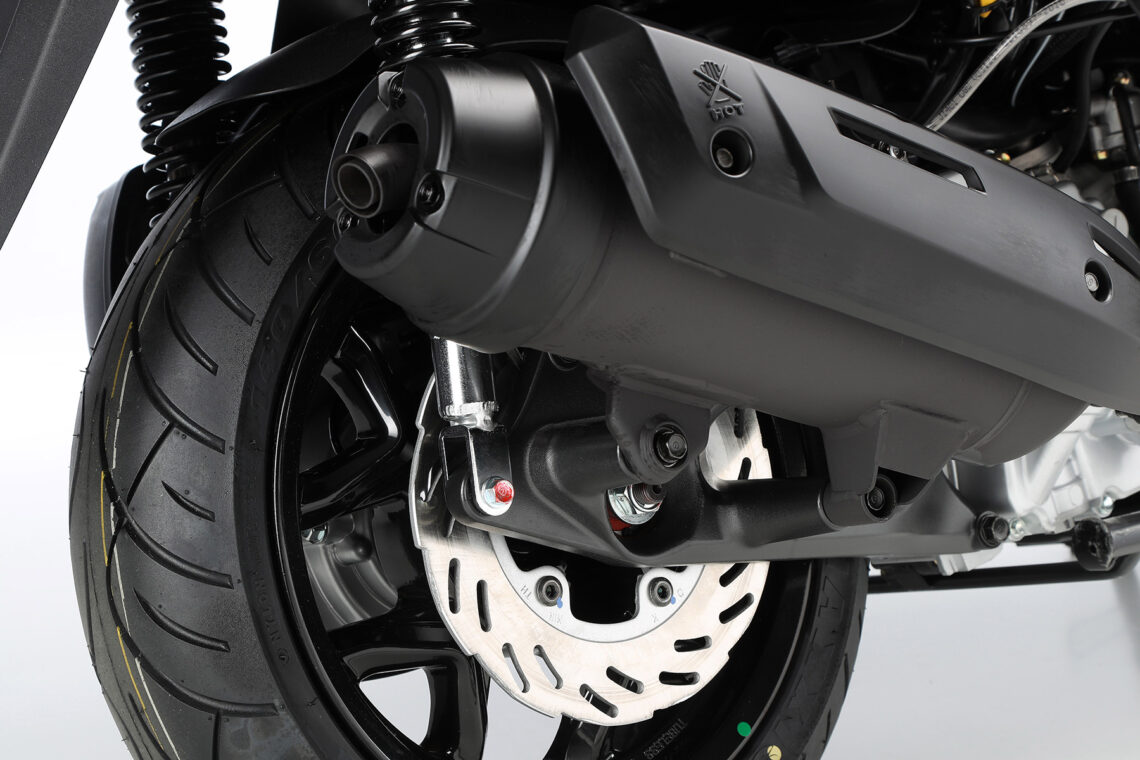 En cuanto a los neumáticos, se trata de un scooter de rueda pequeña, lo que le confiere mayor capacidad de carga bajo el asiento (48 L, caben dos cascos integrales). Sus medidas son 120/70-14 para la rueda delantera y 140/60-13 para la trasera.