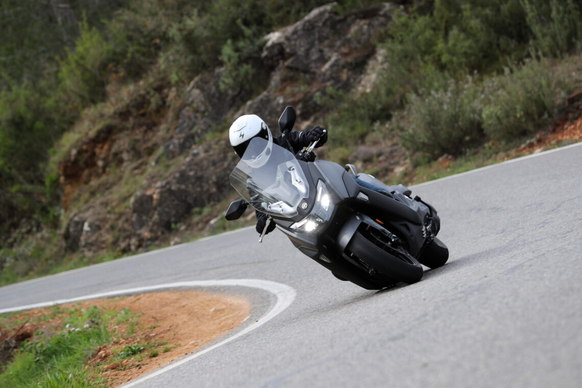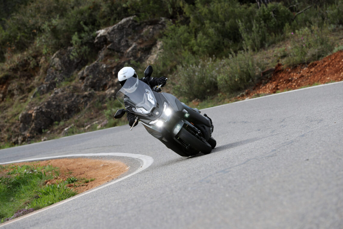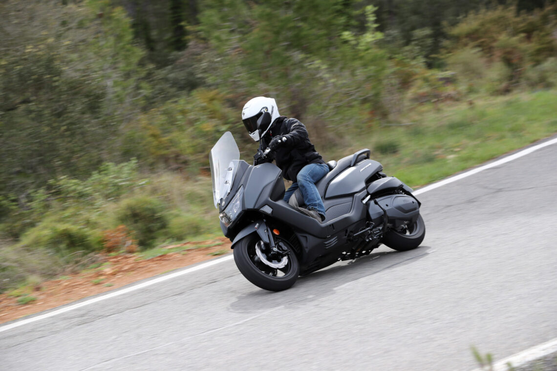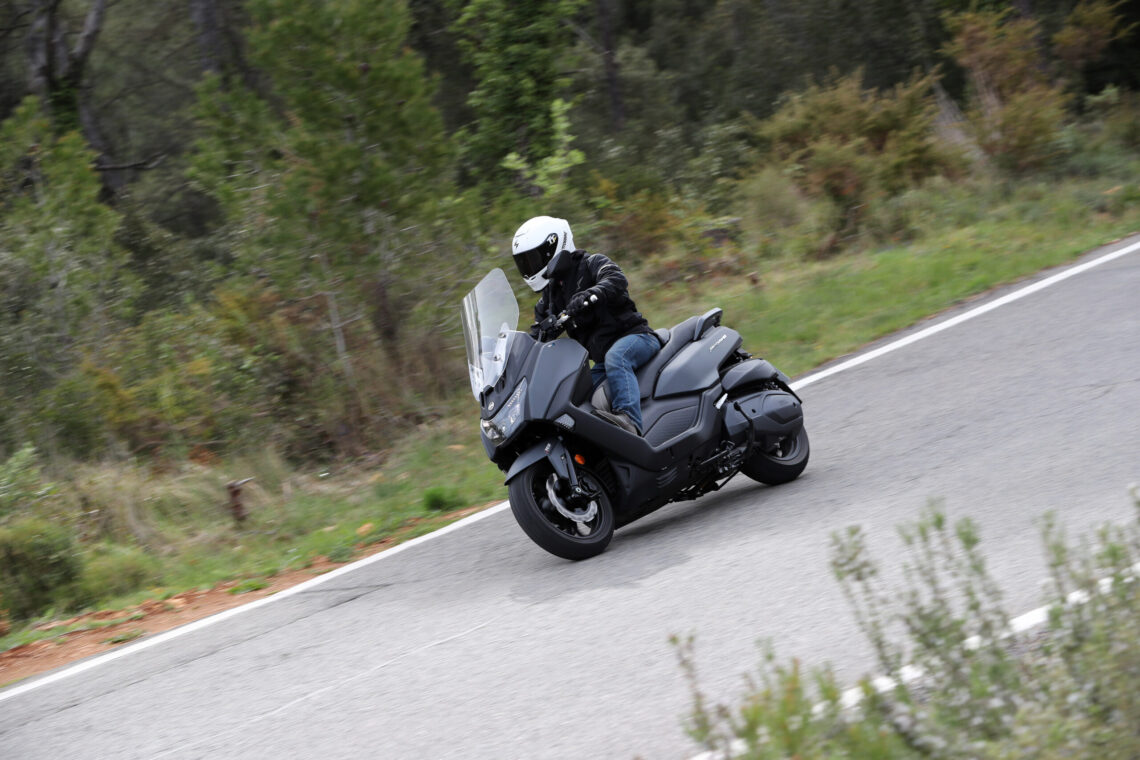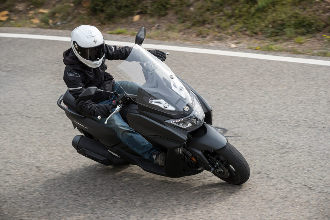 Ahora viene lo bueno; carreteras de curvas reviradas, montaña, frenadas y aceleraciones. Madre mía, estamos ante un scooter mucho más deportivo de lo que aparenta, incluso me atrevo a decir, más de lo que su carrocería puede soportar. Me explico, al poco de empezar a curvear, su agilidad, su rapidísima entrada a curva y su buen comportamiento del conjunto chasis-suspensiones hizo que me fuera animando, y no tardé mucho en empezar a rozar la quilla inferior, hasta ser un contínuo roce en cada curva cada vez que me animaba un poco.