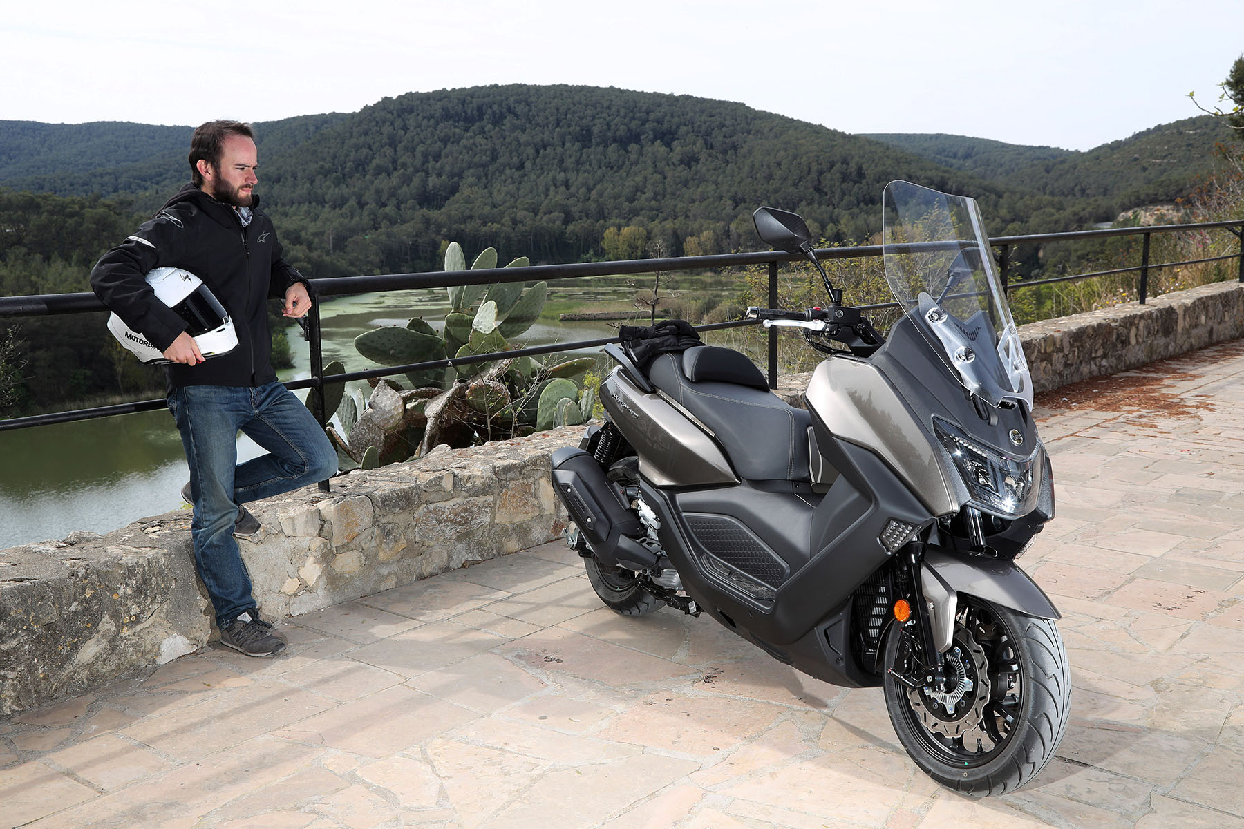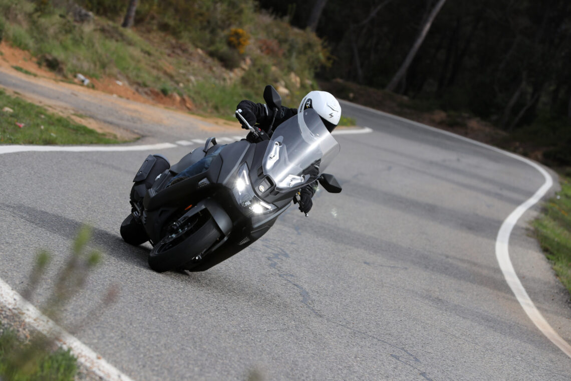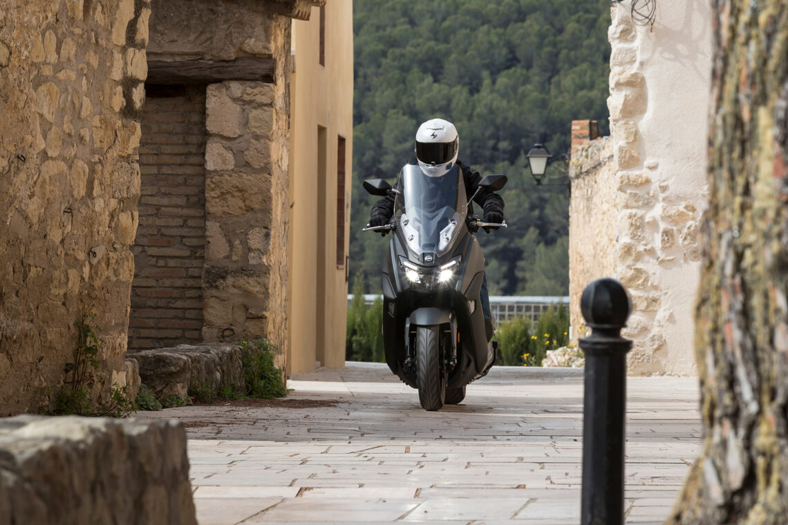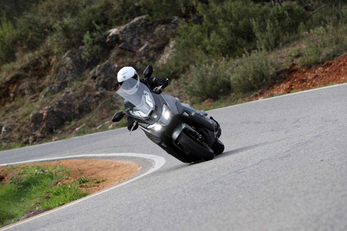 Ahora viene lo bueno; carreteras de curvas reviradas, montaña, frenadas y aceleraciones. Madre mía, estamos ante un scooter mucho más deportivo de lo que aparenta, incluso me atrevo a decir, más de lo que su carrocería puede soportar. Me explico, al poco de empezar a curvear, su agilidad, su rapidísima entrada a curva y su buen comportamiento del conjunto chasis-suspensiones hizo que me fuera animando, y no tardé mucho en empezar a rozar la quilla inferior, hasta ser un contínuo roce en cada curva cada vez que me animaba un poco.