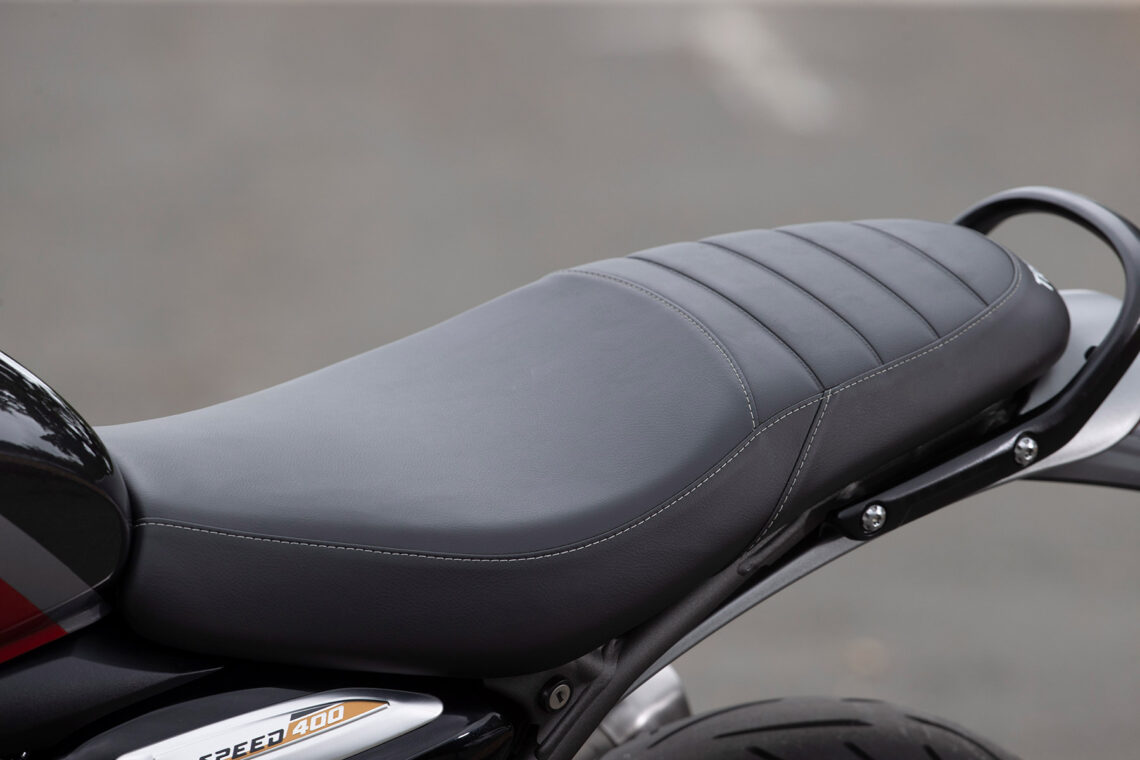 Acelerador RbW, sistema de inyección electrónica y ABS firmados por Bosch, control de tracción (desconectable), iluminación full-LED, toma de corriente USB-C (a la derecha del clausor), retrovisores en las puntas, instrumentación mixta analógica-LCD, cubrecárter corto y neumáticos Metzeler Sportec M9 RR se incluyen de serie. La Triumph Speed 400 declara 170 kg llena, con un depósito de gasolina de 13 l.