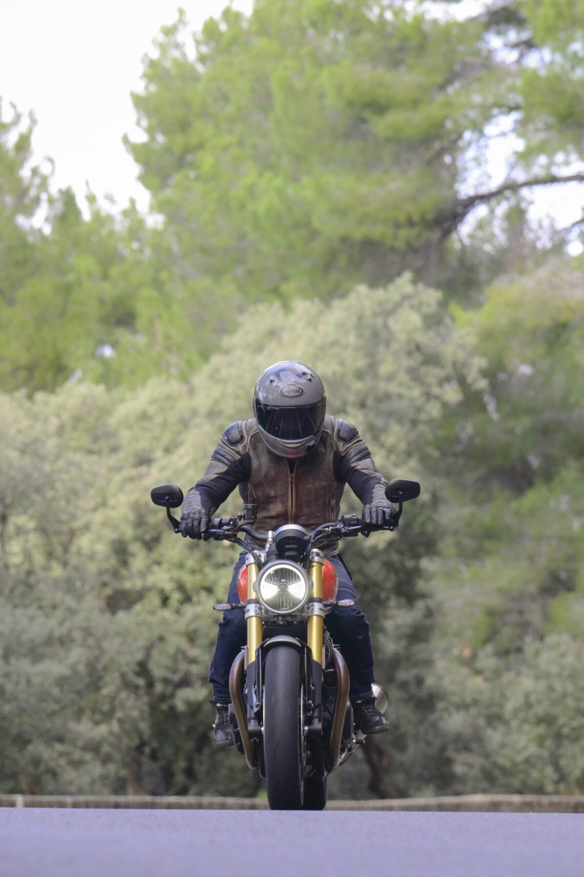 En marcha adquieres bastante más información del tren delantero, una entrada a curva más incisiva pero con menos palanca, ojo. También ganas más firme y solidez en general, lo que se transmite al asiento, más elaborado pero, más duro con el paso de los kilómetros. Lo mismo sucede con la espalda, se sufre un poquito más cuando rebasas la frontera de los 200-250 km de ruta.
