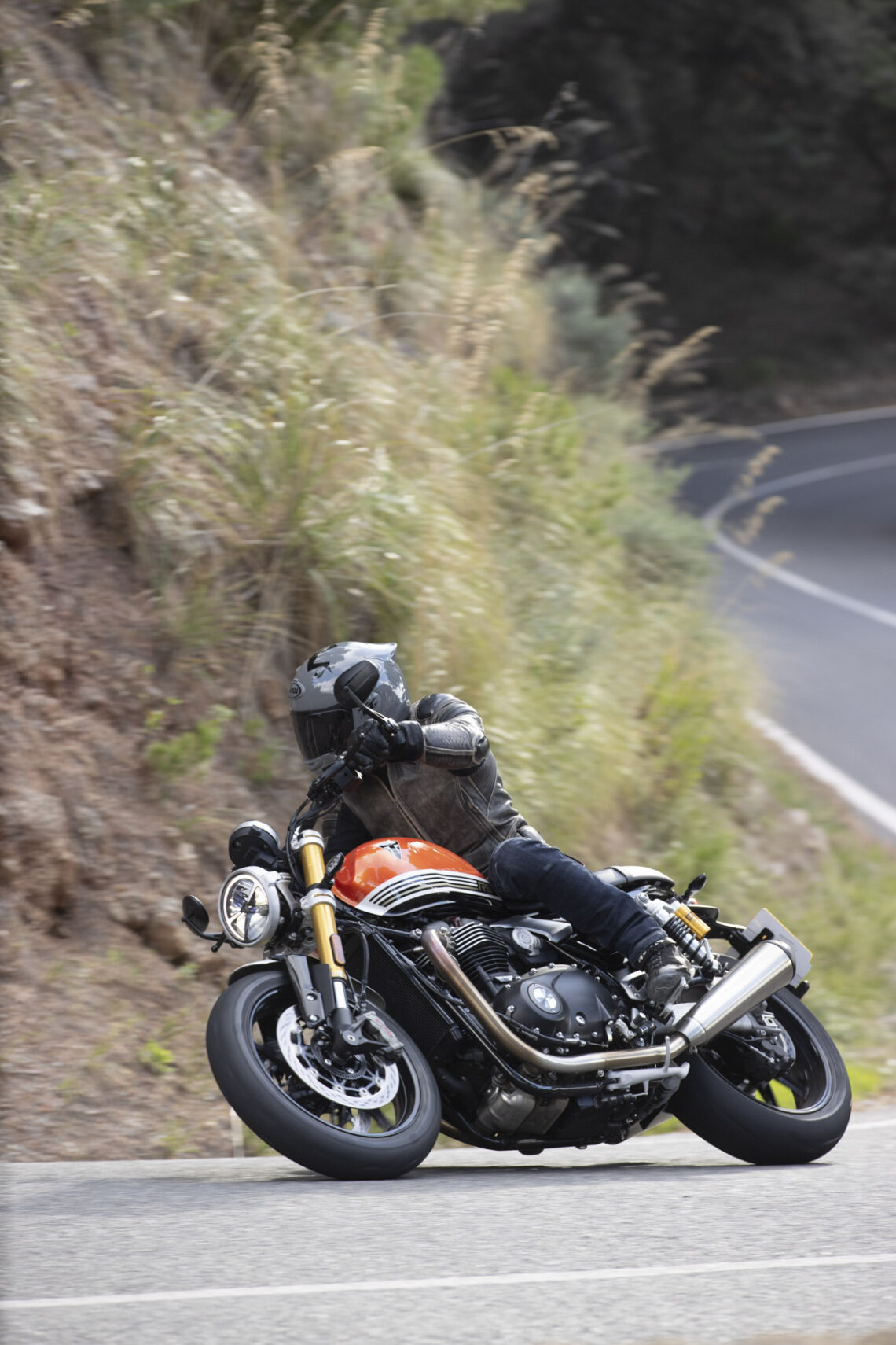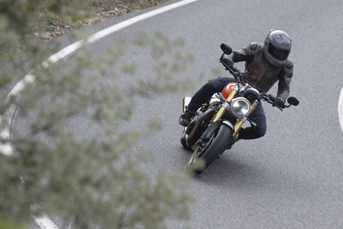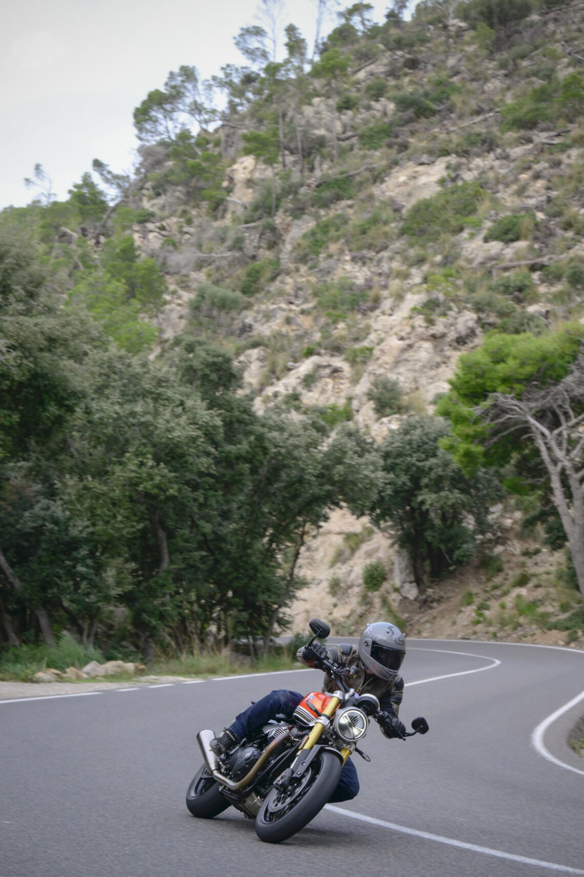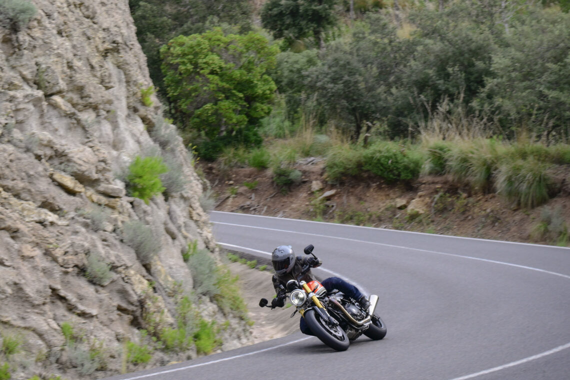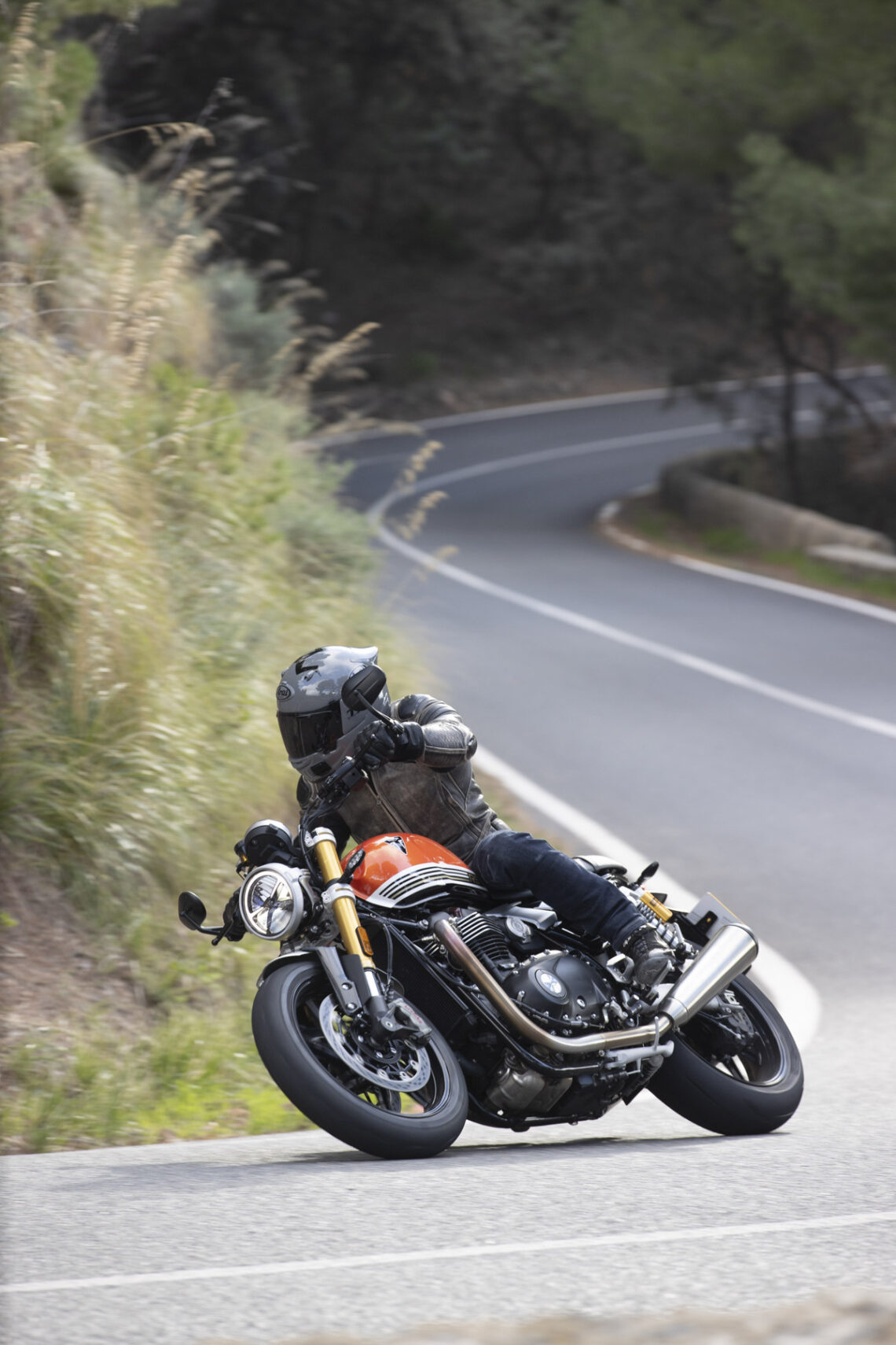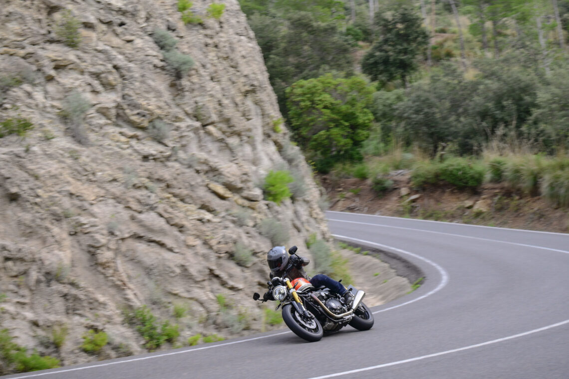 Su otro punto estrella, con un análisis muy similar al de las suspensiones. Hay una considerable mejora en todos los aspectos, difícilmente notable por carretera. No considero la Triumph Speed Twin 1200 RS una moto de circuito, pero con estos componentes no me cuesta imaginarlo. Los Brembo Stylema ofrecen un tacto más directo que la frenada Triumph que viene en la Speed Twin 1200 estándar —que no mejor—, y una mordiente muy similar pero que, con la temperatura solo podrá ir a mejor sin desfallecer, contemplado para situaciones de uso más intensivo. Lamentablemente no fui capaz de crear esa situación por carretera, por lo que en este apartado solo puedo darle un 10/10 virtual, compartido (a excepción del tacto de la maneta) con la frenada de la Speed Twin 1200 estándar, que para carretera responde casi* igual.