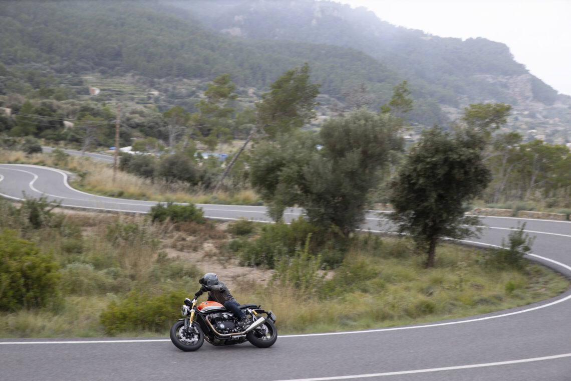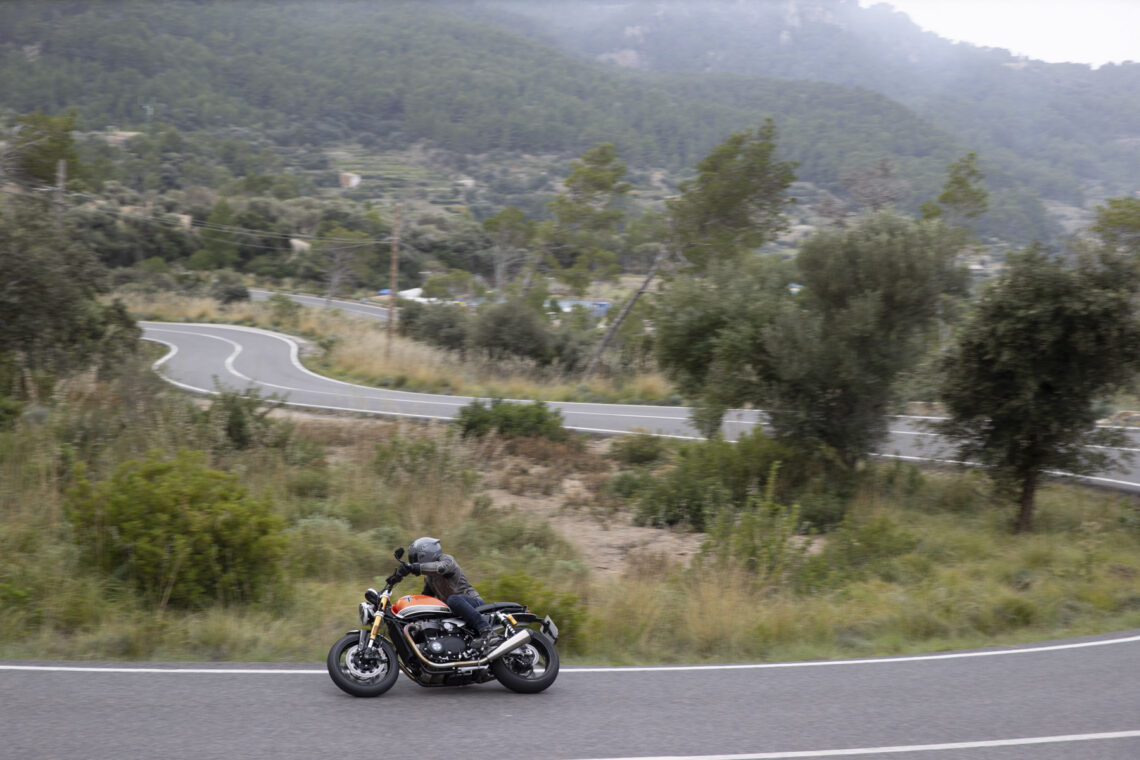 Ahora, en ergonomía, la versión RS tiene bastante que decir. Es como si cogieras la versión normal y la encararas un poco hacia delante. En todos los sentidos. Las estriberas están un puntito más elevadas y retrasadas, el asiento un puntito más elevado, y el manillar un puntito más bajo. Son puntitos pequeños que juntos, suman una moto con una ergonomía notablemente más deportiva. Es como si la Speed Twin hubiese pasado un verano con sus primas Speed Triple RS.