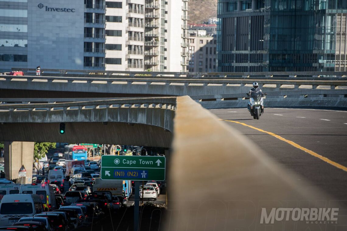 Salimos por la ciudad con el Modo T. Su carácter es muy dócil y suave y sólo cuando enroscas con decisión el puño del acelerador deja salir su potencia. Será muy útil en condiciones de lluvia, ya que es muy dulce. Sin embargo, en condiciones normales te decantarás por el modo S, donde los 45 cv de potencia brillan por sí mismos y la entrega de par es realmente notable en todo el cuentarrevoluciones. No por ser un scooter deportivo deja de ser amigable contigo. El exquisito trabajo en el acelerador electrónico hace que puedas regular el gas con gran precisión y que su entrega sea igual de constante. Eso sí, cuando necesitas una respuesta contundente, el motor ruge con un sonido grave y te dispara hasta altas velocidades casi sin darte cuenta. La reducción de peso siempre viene bien y en este caso el TMAX se siente mucho más ágil entre los atascos de Cape Town. Los nuevos retrovisores son muy vistosos, pero quizá con mayor superficie el conductor se sentiría más seguro, sobre todo en el ámbito urbano.