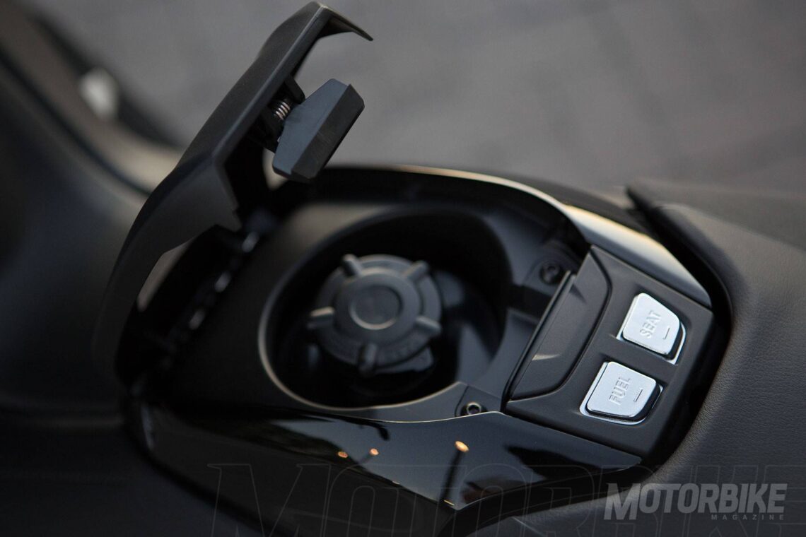 - Capacidad: Bajo el asiento cabe un casco integral y uno demi-jet (o dos demi-jet). Además, cuenta con dos espacios adicionales para otros objetos, uno de ellos con toma de 12V para conectar dispositivos.