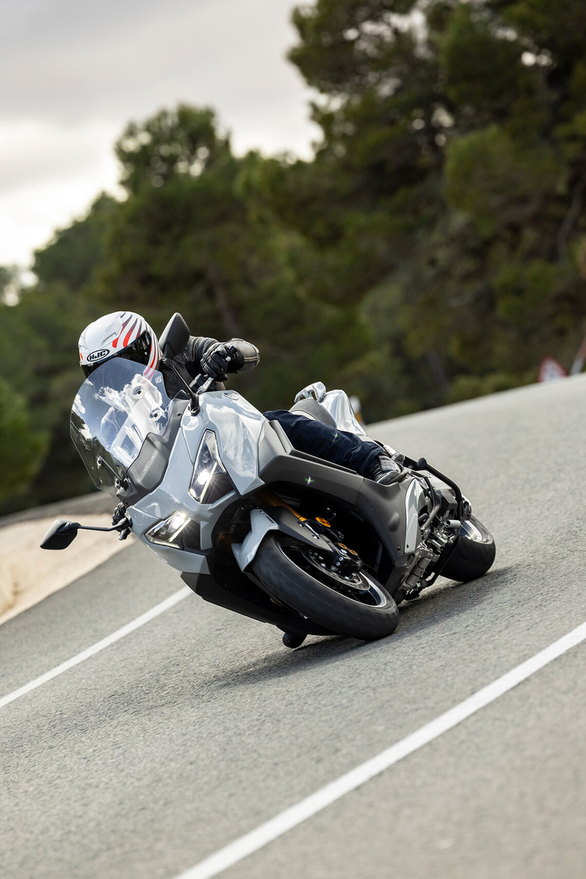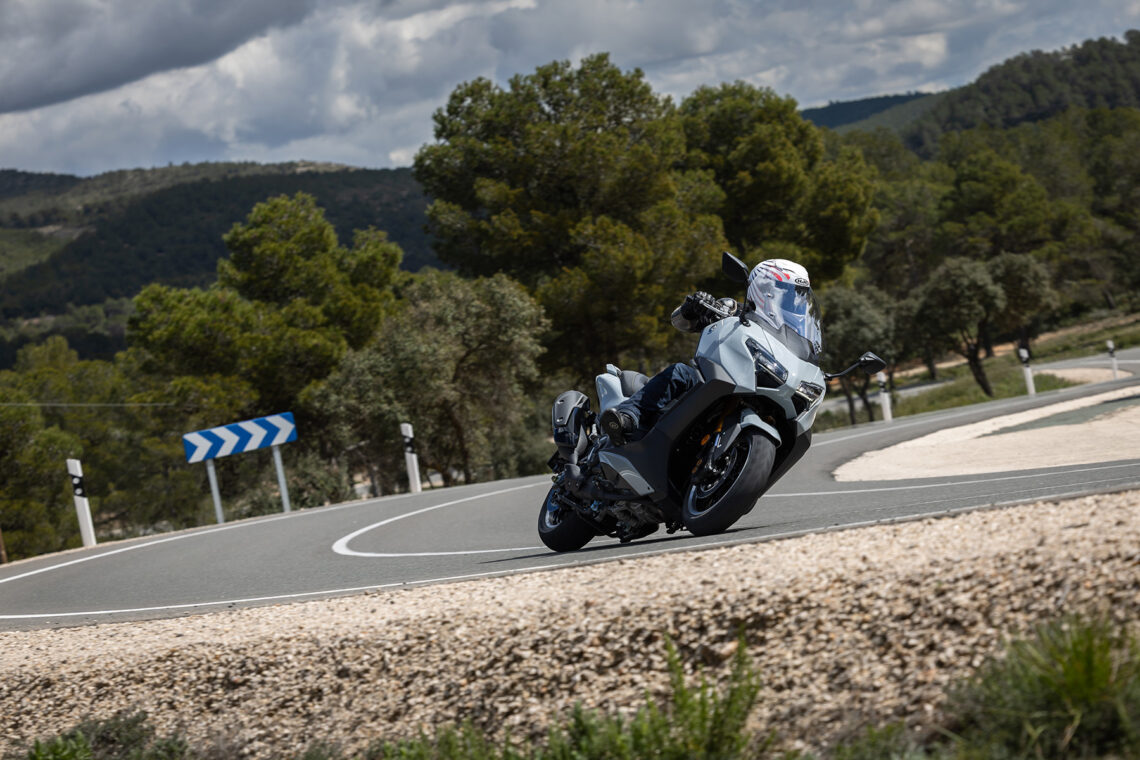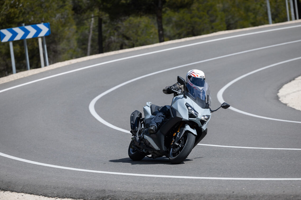 Aquí también nos seguimos encontrando la misma nave que en el modelo anterior. Mismo comportamiento y misma personalidad. Realmente en este punto no ha cambiado, pues el chasis es el mismo así como su geometría. Si bien es un scooter muy deportivo, la pretensión de este vehículo tampoco es la de hacer tiempos en un circuito o buscar las máximas inclinadas por carretera. Prueba de ello es que sigue rozando con "relativa" facilidad. Existe la posibilidad de quitar un tope de goma que silencia la recogida del caballete, logrando así cerca de 1 cm más de altura del caballete y por tanto más ángulos de inclinación. Pero sigue rozando.