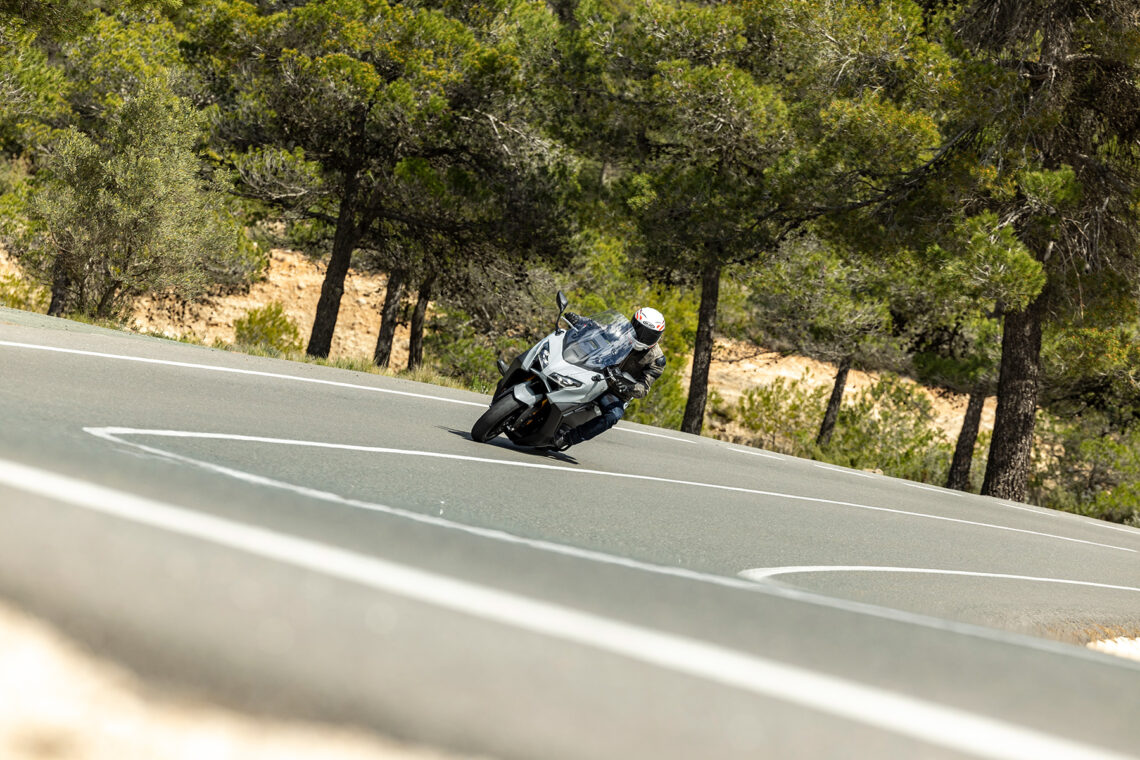 Los modos de conducción S y T (S = Sport, y T = Touring) ahora se podría decir que son un poquito más notables, cosas que el modelo anterior era difícil discernir. Además en el modo S puedes empezar a apurar las frenadas con bastante agresividad así como las aceleraciones al salir de curva. En este escenario, donde todavía sigues muy inclinado, la rueda empieza a tener pequeñas derrapaditas, casi impercetpibles para nosotros pero no para un control de tracción. Esto se puede apreciar un poco mejor con el modo S como decíamos.