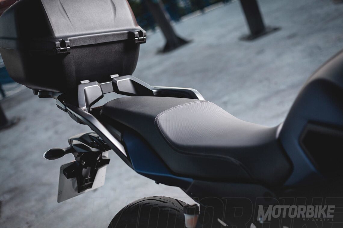 Además, este modelo cuenta con interesantes accesorios opcionales para acentuar más su vena rutera, y que, en el caso de nuestra unidad de pruebas, venía con la pantalla alta regulable manualmente en altura, los puños calefactables, un baúl trasero de 39 litros de capacidad (y que necesita la instalación previa de una parrilla que incluye los asideros para el pasajero) o una bolsa para el manillar en el que poder llevar nuestro móvil y que cuando bajas de la moto se puede llevar cómodamente en tu cinturón. Pero por supuesto, también puedes encontrar en el catálogo de accesorios las maletas laterales, protectores de quilla, motor o radiador, faros antiniebla, estriberas, manetas...