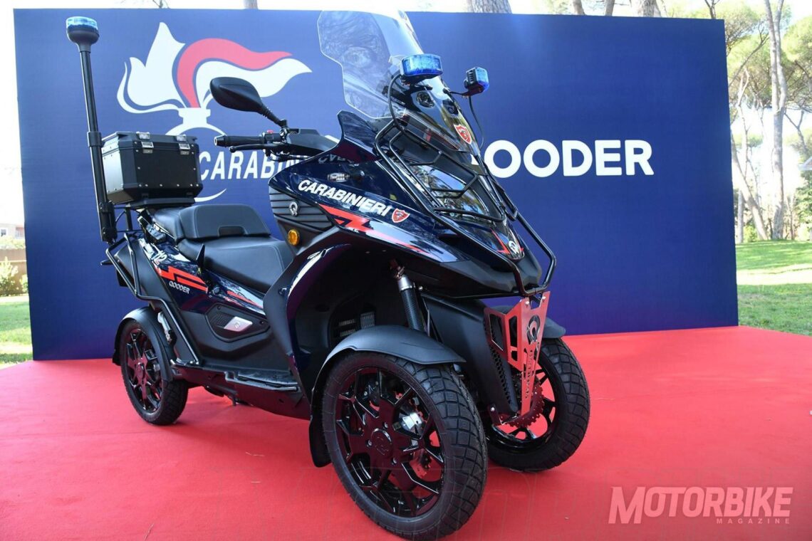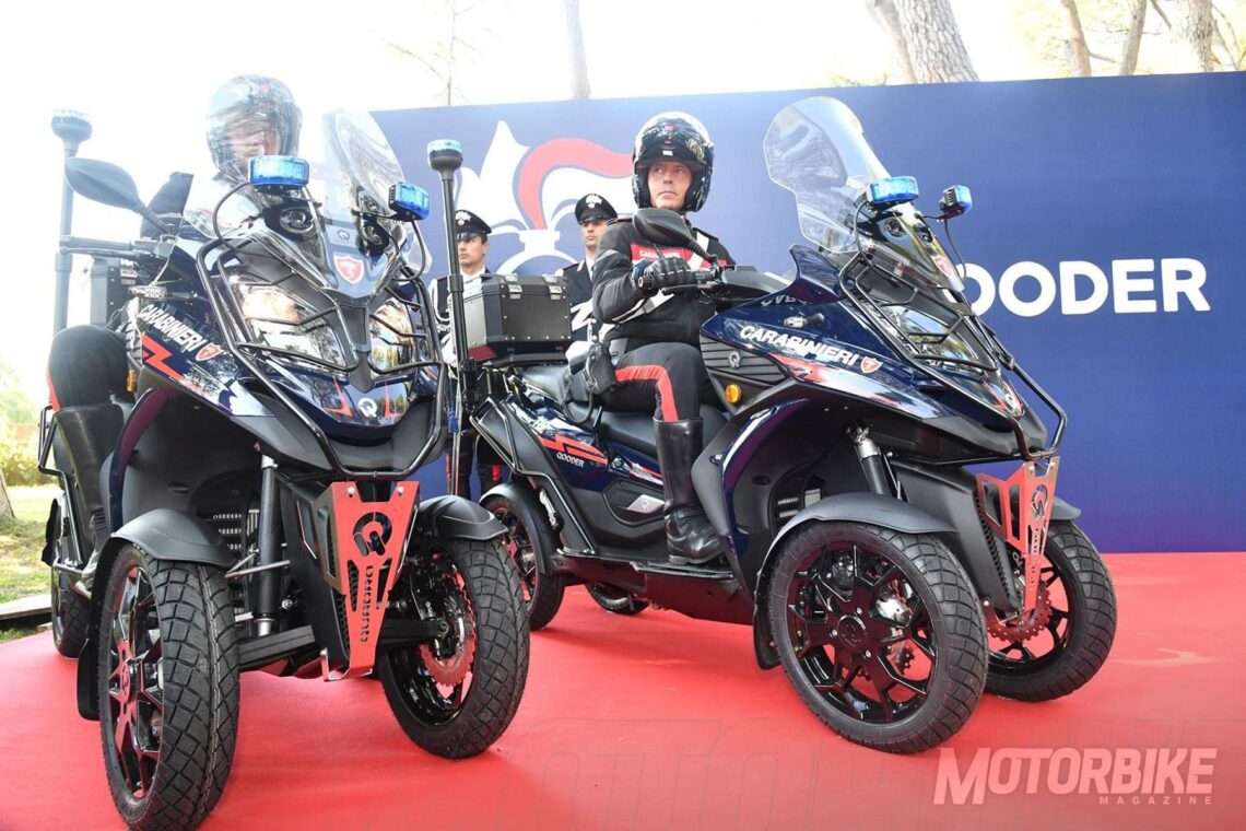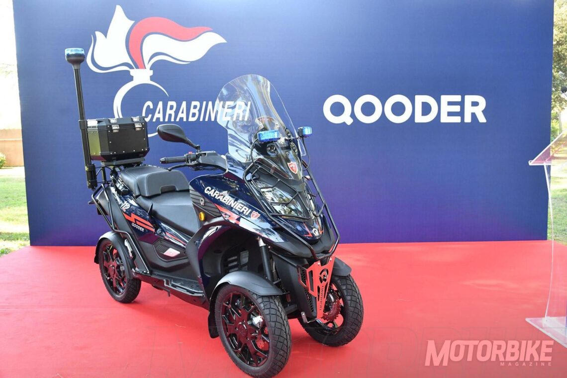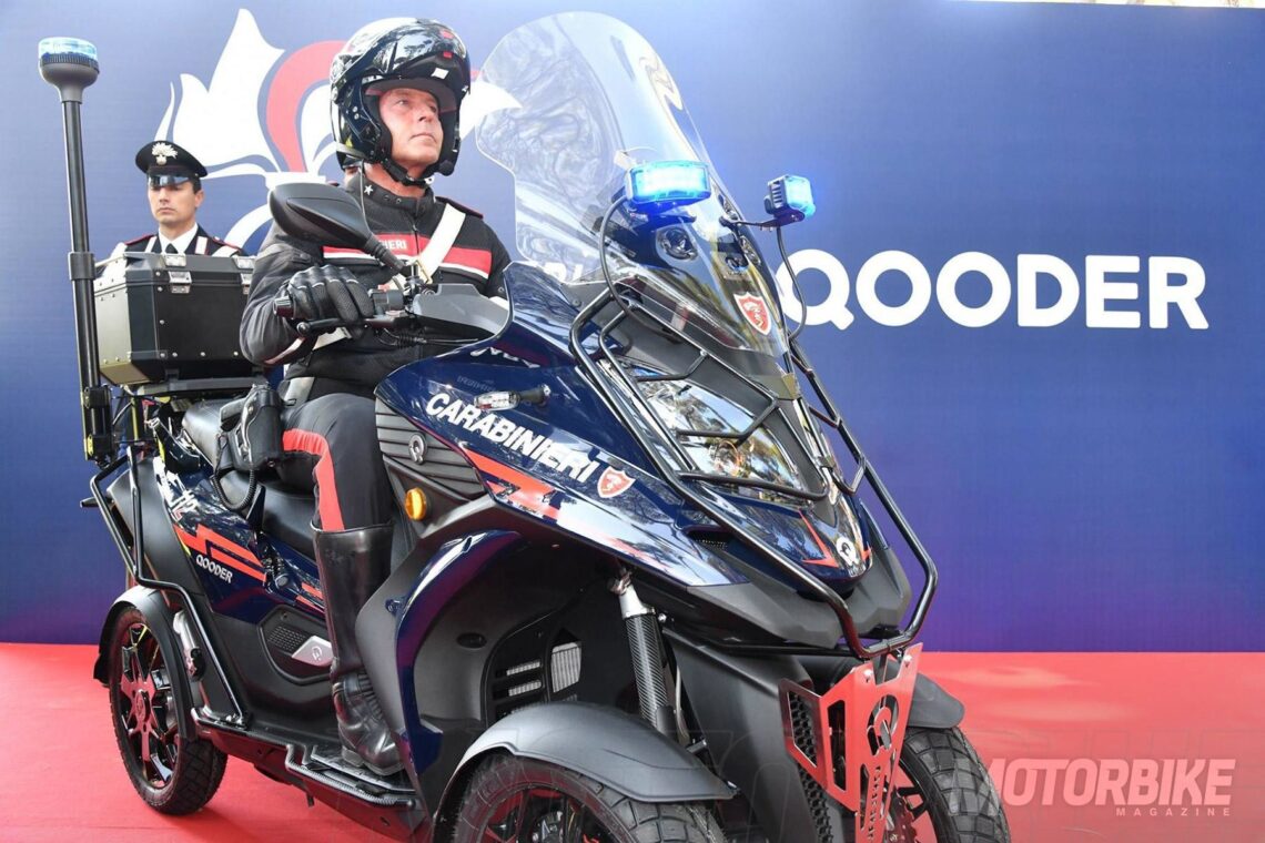 El Quadro Qooder, el scooter suizo de cuatro ruedas, se ha convertido desde este verano en un nuevo vehículo para los Carabinieri, la policía italiana. Gracias a este acuerdo, los residentes y turistas de la zona de Lucca y Rimini, verán como este cuerpo policial patrulla a lomos de este scooter, un vehículo de 400 cc y de 32,5 cv de potencia que puede conducirse con el permiso B de coche al estar homologado como triciclo.