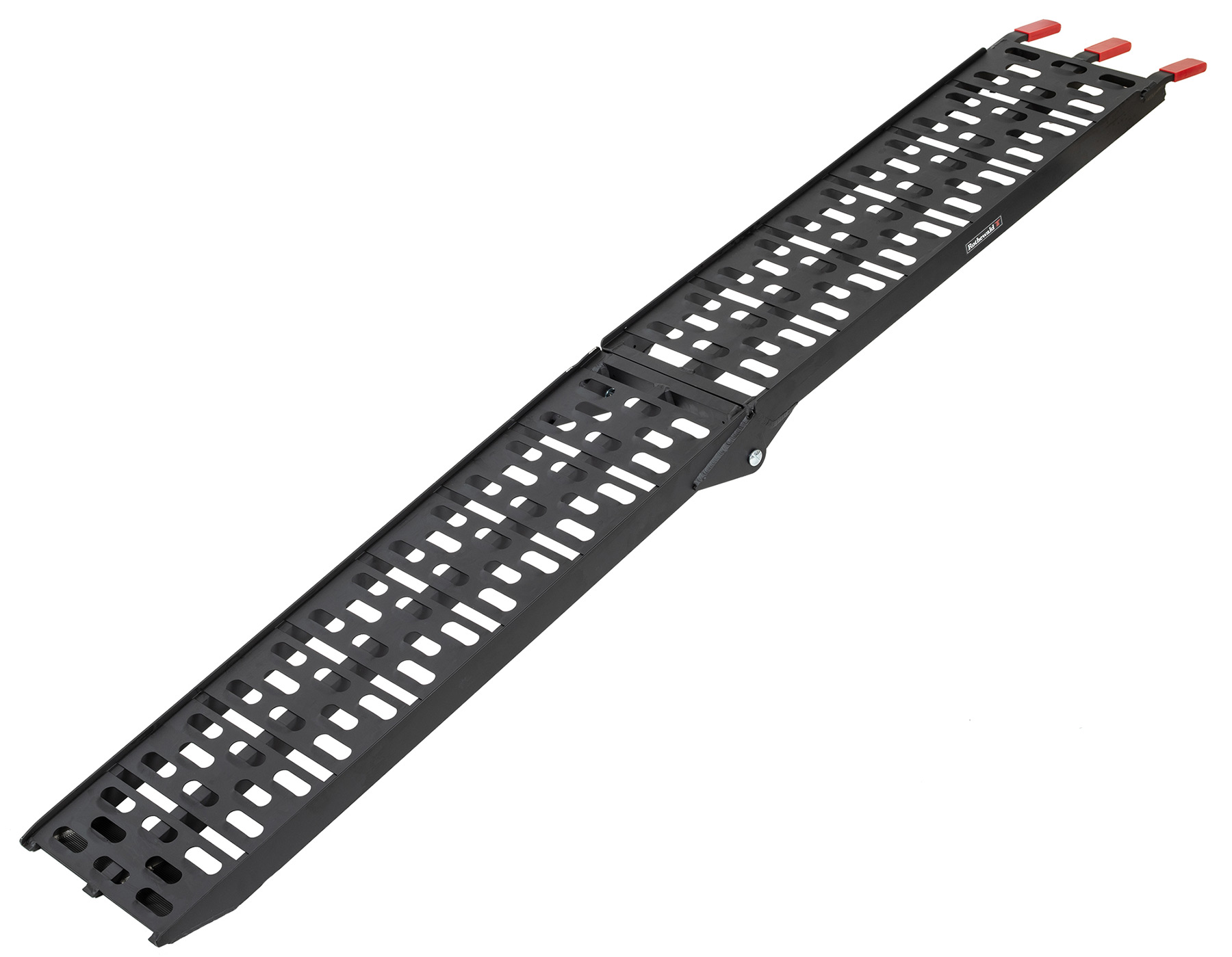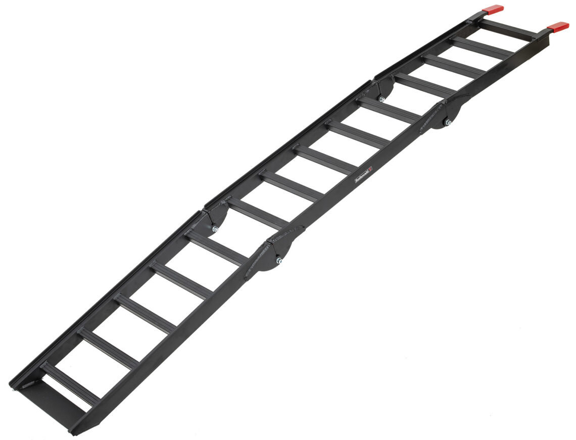 La rampa de carga de 2 piezas Rothewald es la más robusta de las dos, con un diseño más robusto pensado para cargas pesadas (motos de más de 300kg). Su sistema de pliegue es partido, juntándose las dos partes en una de 100 cm de largo. Esto significa que desplegada tiene una longitud de 200 cm, con una altura de carga aproximada de 90 cm y un peso total de 6,2 kg. Para lograr este peso y la mencionada capacidad de soporte, Rothewald ha fabricado su rampa de carga en aluminio, junto al contrastado diseño ligeramente combado. Sus medidas plegada (L x An. x Al.) son: 102 x 30 x 13 cm.