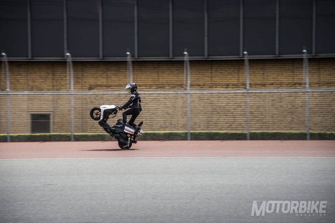 El reto se realizó en un circuito oval empezando por la mañana y manteniendo una velocidad media de 40 km/h. Para pasar el 'trago', sus asistencias tenían que darle líquido y bebidas energéticas desde otro scooter, como podéis ver en las fotos y en el vídeo. También es curioso ver cómo se hace a sí mismo el repostaje mientras hace el wheelie.
