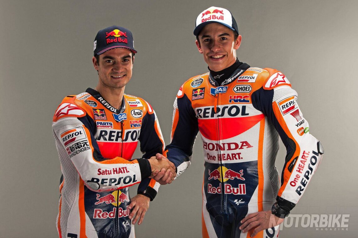 Hace unos días te presentábamos las fotografías de estudio de la nueva RC213V del Repsol Honda Team, una moto cuya decoración fue desvelada en la presentación oficial. En esta ocasión te traemos las imágenes oficiales de sus dos pilotos, Marc Márquez y Dani Pedrosa, que compartirán box por tercera temporada consecutiva.