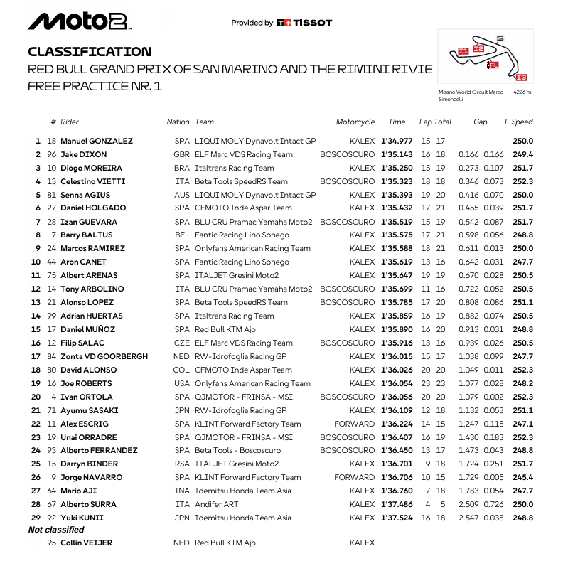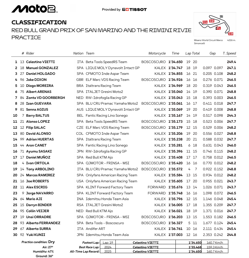 Resultados Moto2 Misano: GP San Marino 2025 - viernes