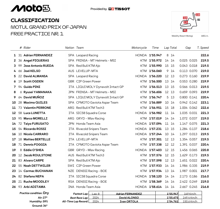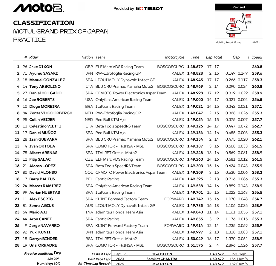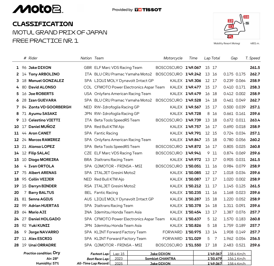 Viernes redondo para Jake Dixon, un piloto de altibajos que parece estar ante uno de esos fines de semana en los que se muestra intratable. El británico trituró el récord absoluto de la pista (1:48.679) para cerrar la primera jornada en cabeza tras ser el más rápido tanto por la mañana como por la tarde. Segundo terminó Ayumu Sasaki en su mejor día, con diferencia, desde que llegó a Moto2 el pasado año. Motegi es uno de los trazados en los que las Boscoscuro se desenvuelven mejor, como también demostraban el tercer puesto de Izan Guevara y el quinto de Tony Arbolino. Sin embargo, a Guevara le quitaron sus mejores vueltas, hechas con una presión de neumáticos por debajo de lo permitido, lo que le mandó al 12º puesto e hizo a nueve pilotos ganar una posición.