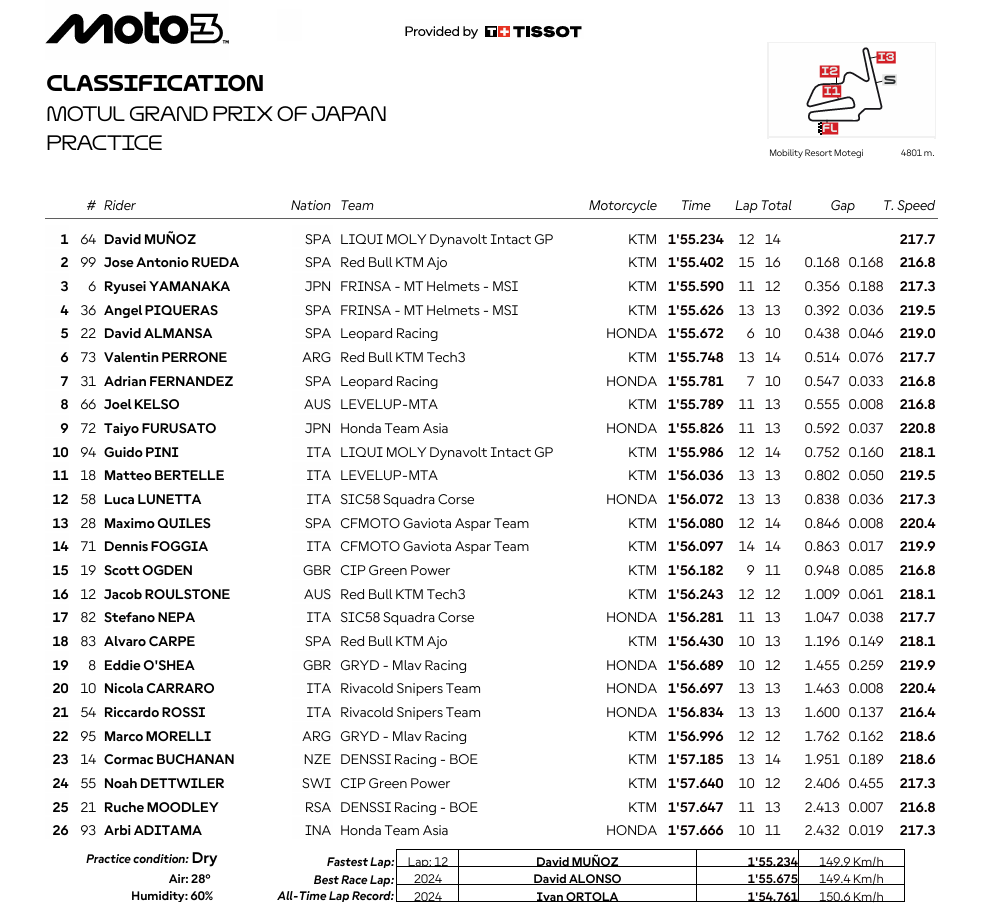 Dominio español en Moto3. Se pasó del triplete del FP1 (Fernández-Piqueras-Rueda) al doblete de la Práctica, con David Muñoz (1:55.234) como el más rápido y con el líder, José Antonio Rueda, siendo la sombra de su paisano. Prometedor viernes para Muñoz ante un Rueda que no baja el listón y que podría fabricarse incluso una bola de partido en Motegi. El ídolo local, Ryusei Yamanaka, terminaba tercero y dejaba claro que dará guerra delante de su público.