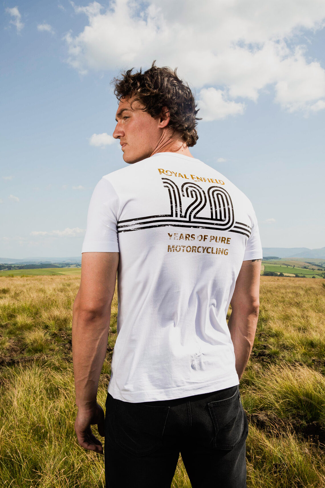 - Camiseta 120º aniversario: Esta camiseta de suave algodón conmemora el dilatado historial motero de Royal Enfield con el logotipo del ave fénix de Belstaff en el pecho y el logotipo de los 120 años en la espalda, para darle un toque conmemorativo a esta cómoda prenda clásica. Disponible en color blanco o aceituna.