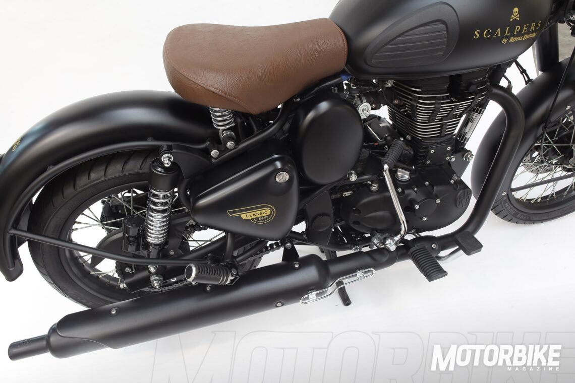 La Royal Enfield Classic 500 Scalpers es una serie limitada con asiento tapizado en polipiel de color marrón, el mismo color que los puños y un acabado en mate. El emblema de Scalpers que es una calavera con el número 10 del décimo aniversario, se puede ver en el depósito y en los laterales.