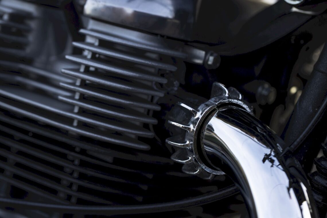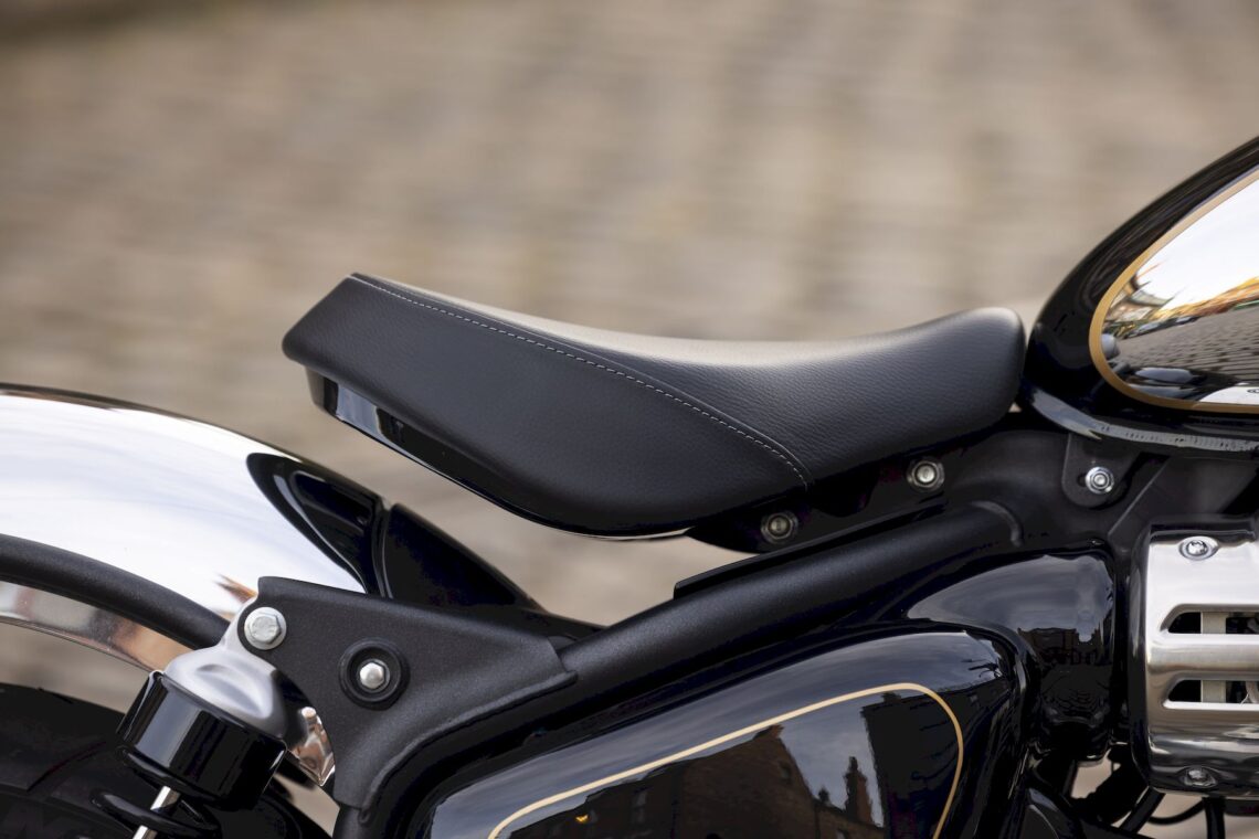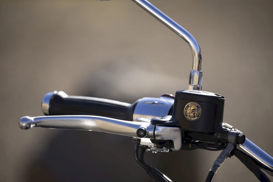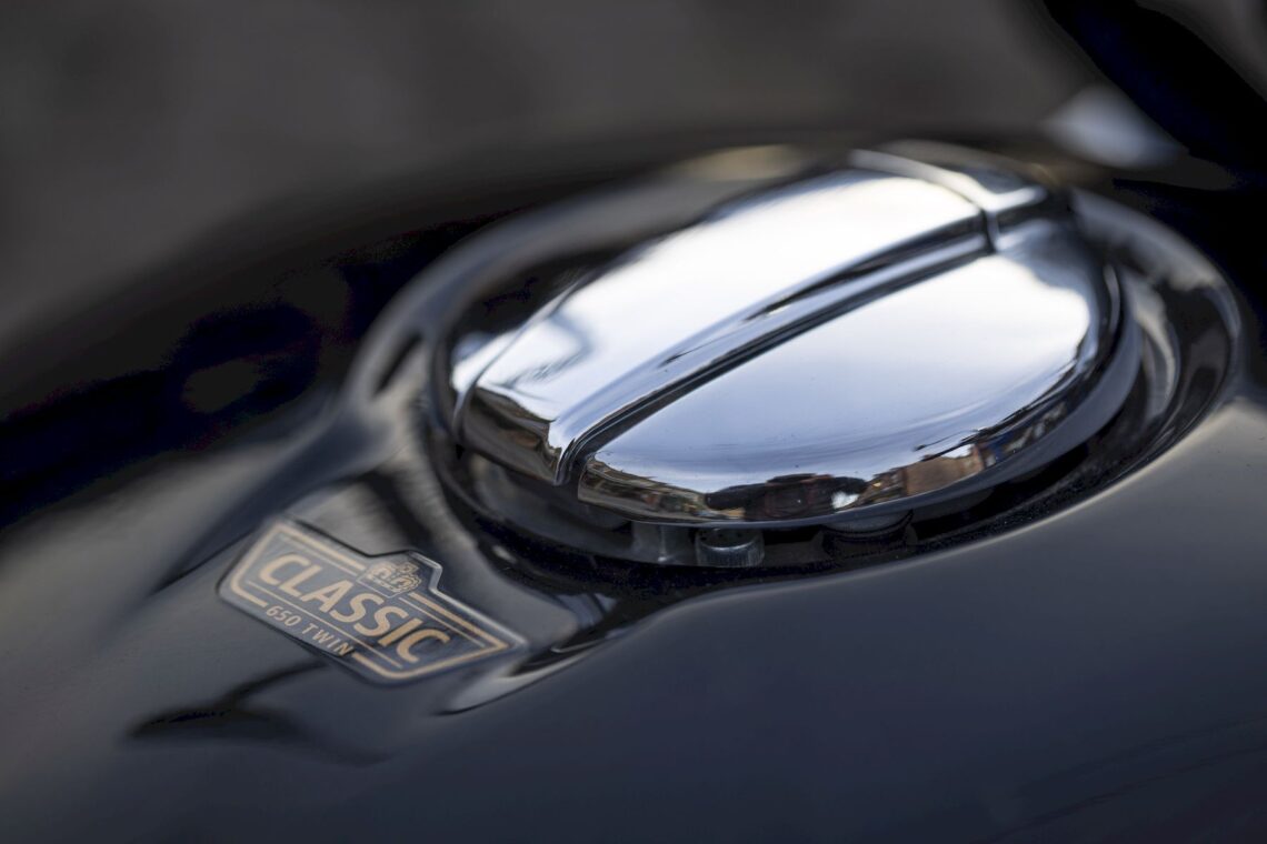 Acabados cromados/pulidos, guardabarros envolventes, silenciadores Peashooter, faro con visera, toma de corriente USB (bajo la maneta de embrague), depósito de gasolina de 14.8 l. (unos 300 km de autonomía en nuestra prueba) y 243 kg declarados en orden de marcha completan el conjunto.