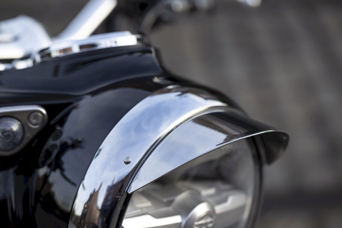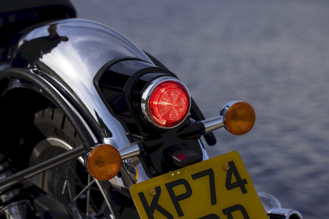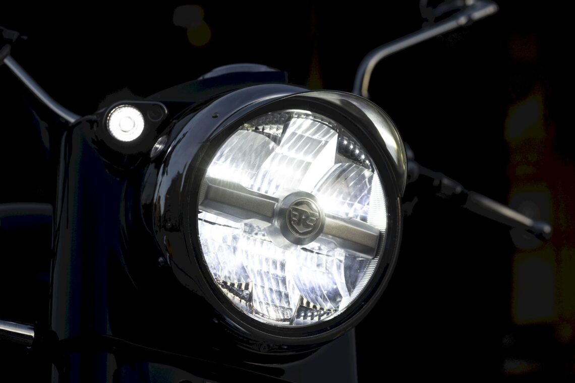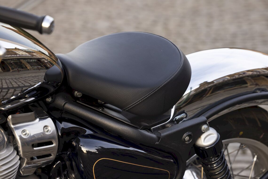 Acabados cromados/pulidos, guardabarros envolventes, silenciadores Peashooter, faro con visera, toma de corriente USB (bajo la maneta de embrague), depósito de gasolina de 14.8 l. (unos 300 km de autonomía en nuestra prueba) y 243 kg declarados en orden de marcha completan el conjunto.