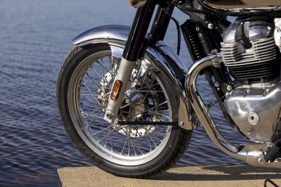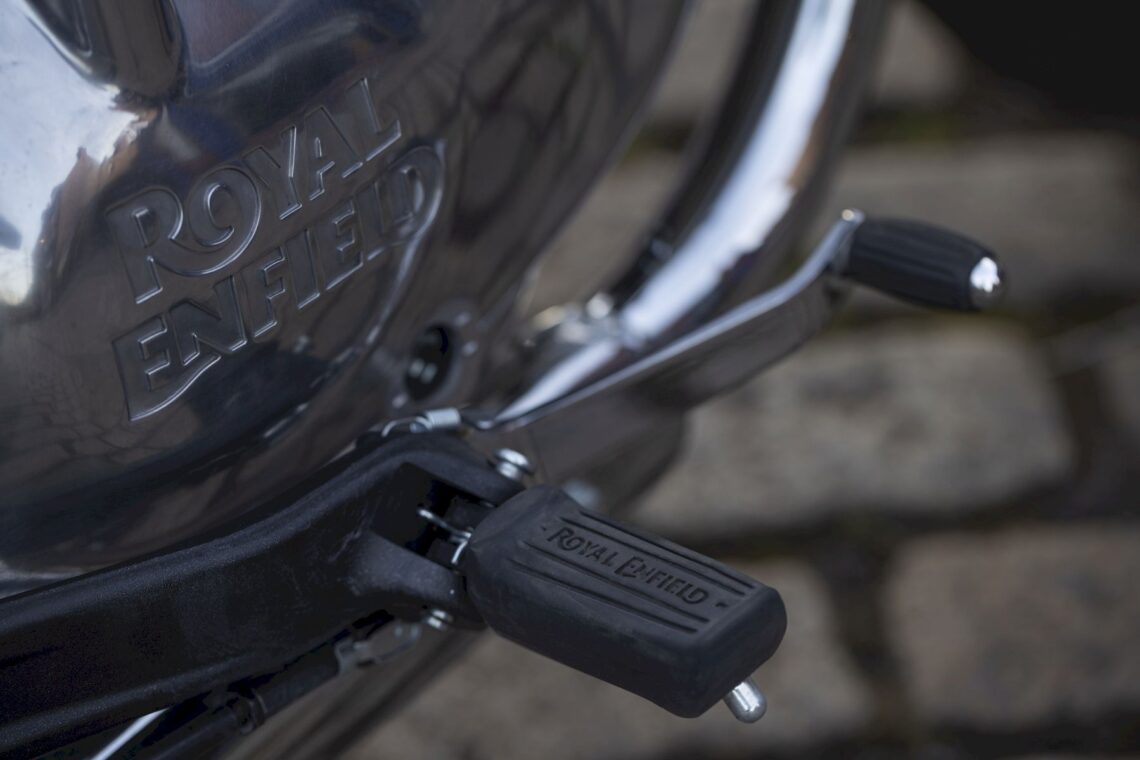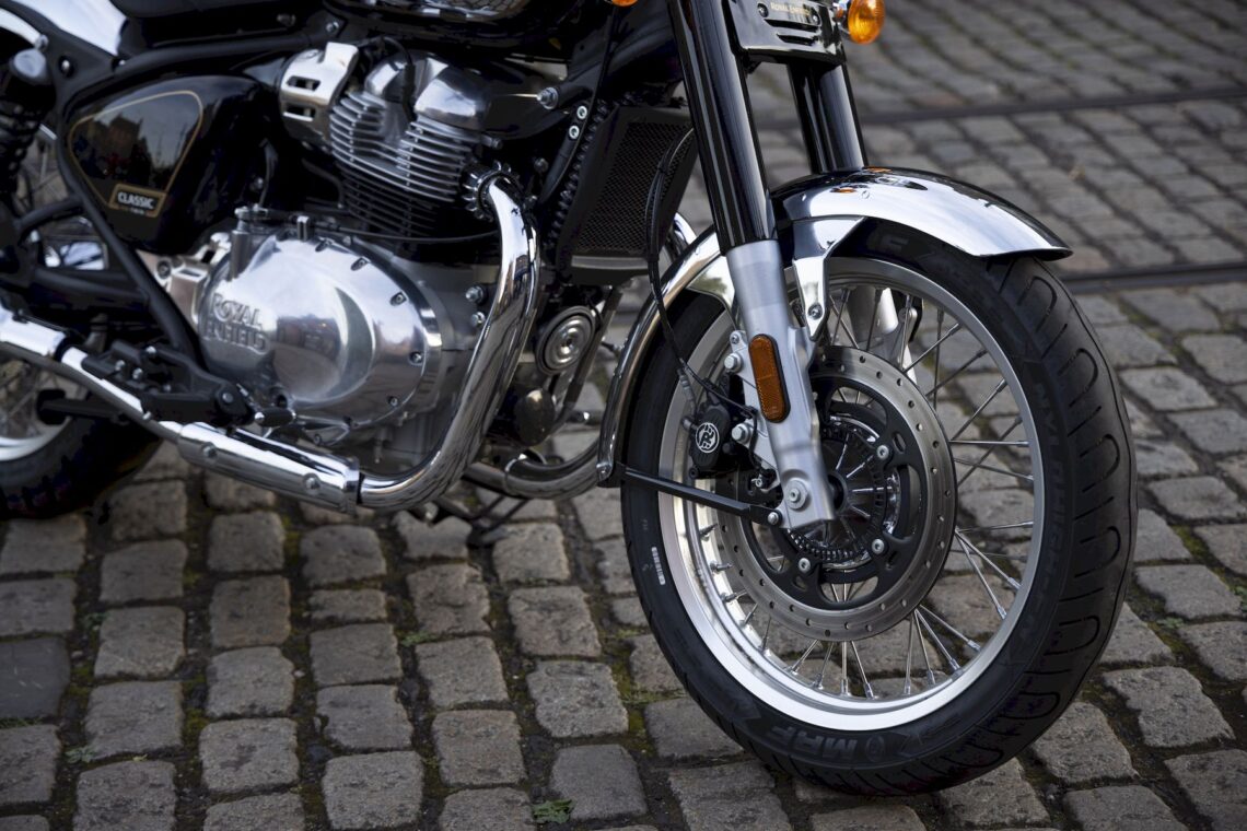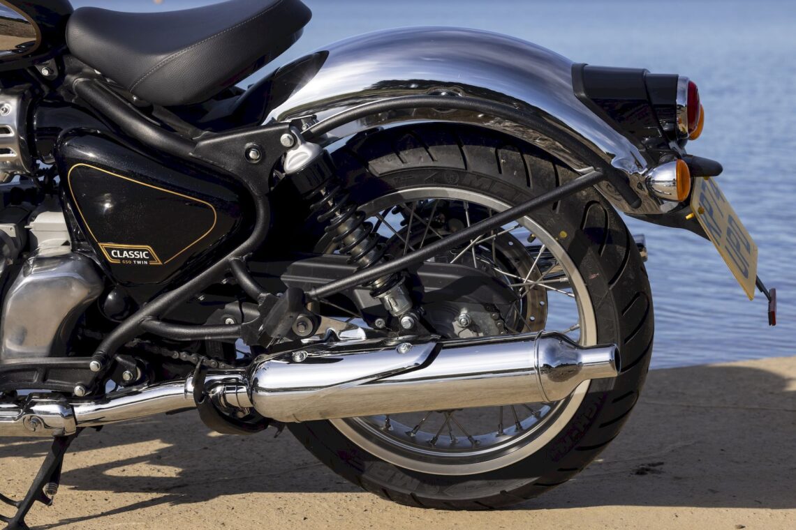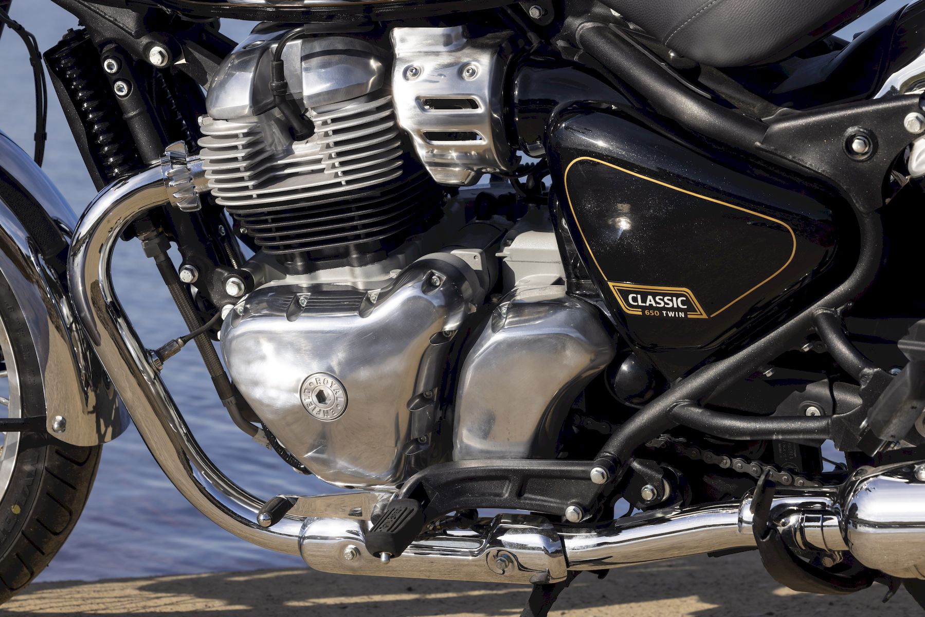 La Royal Enfield Classic 650 está impulsada por un motor bicilíndrico en paralelo SOHC de 648 cc con cigüeñal calado a 270º (busca un tacto V2), 8 válvulas, doble árbol de levas en culata (en vez de en el cárter), radiador de aceite, cambio de 6 velocidades y eje de equilibrado (para minimizar vibraciones). Declara 46.4 CV a 7.150 rpm y 52.3 Nm a 5.150 rpm.
