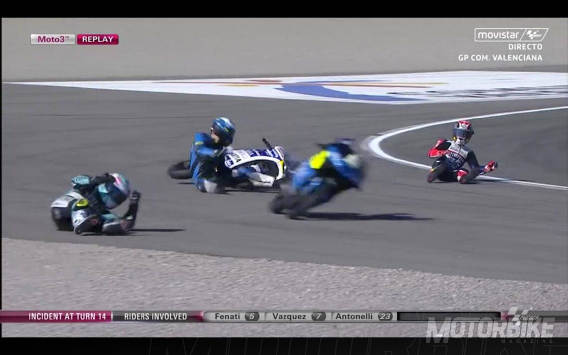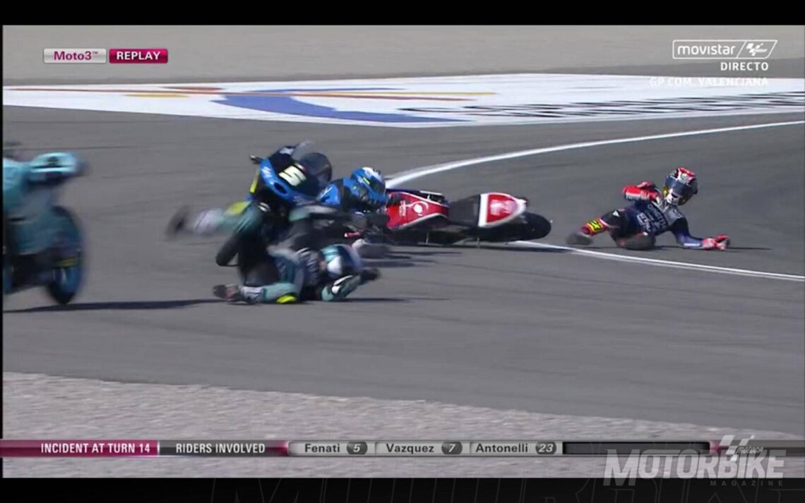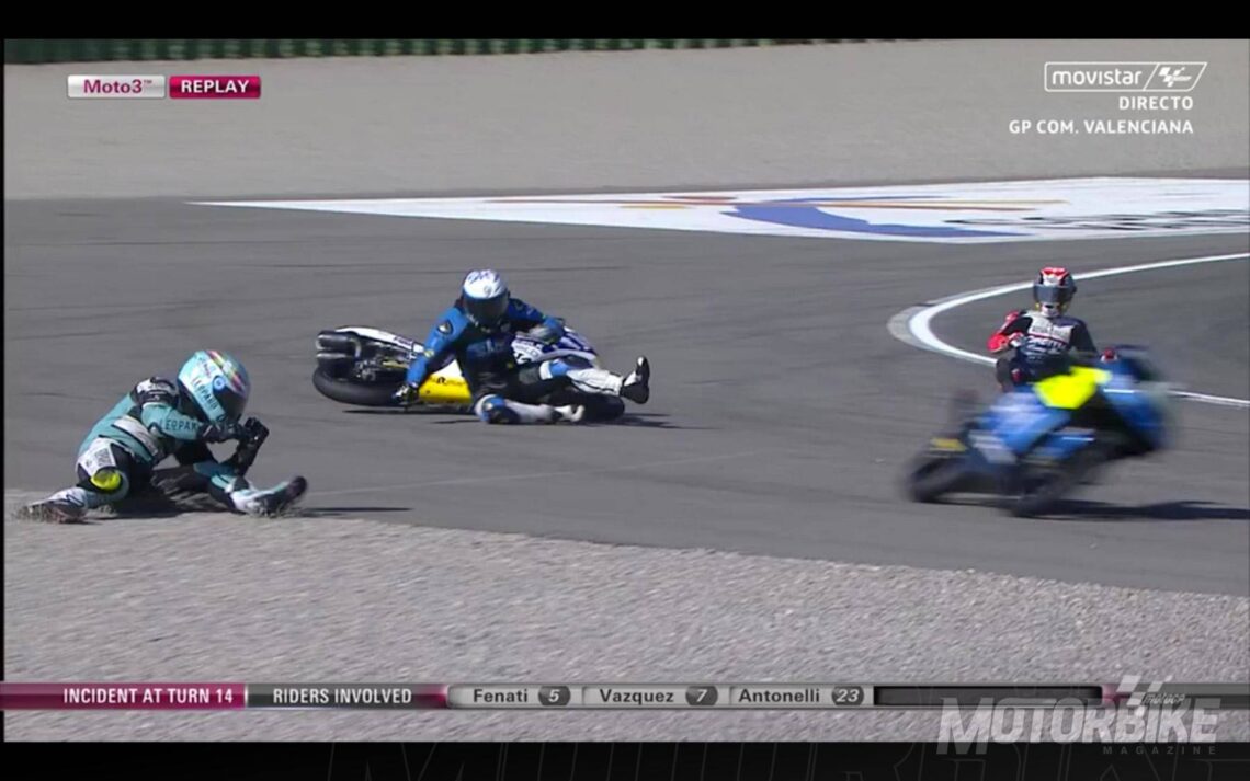 Niccolo Antonelli provoca una caída múltiple en el grupo de cabeza de Moto3 en Valencia. Romano Fenati y Efrén Vazquez no pudieron evitar la envestida del joven piloto italiano.