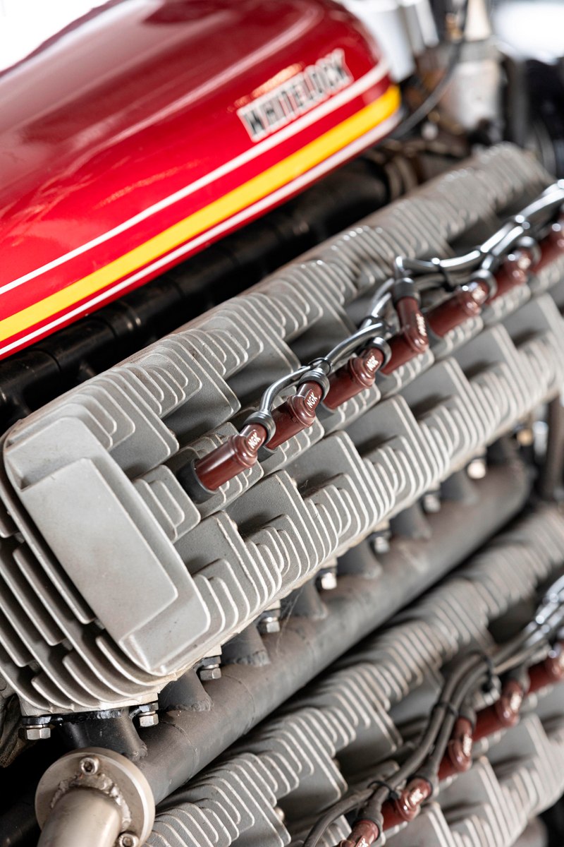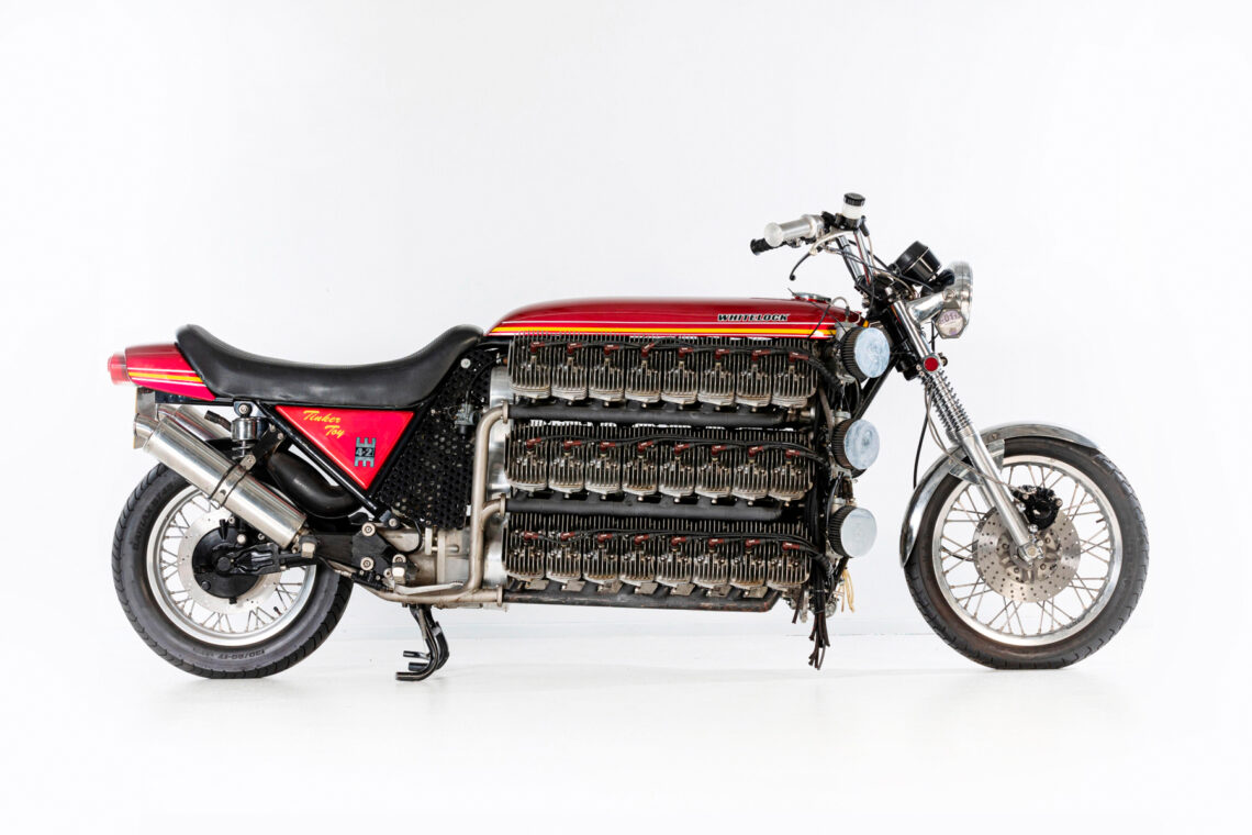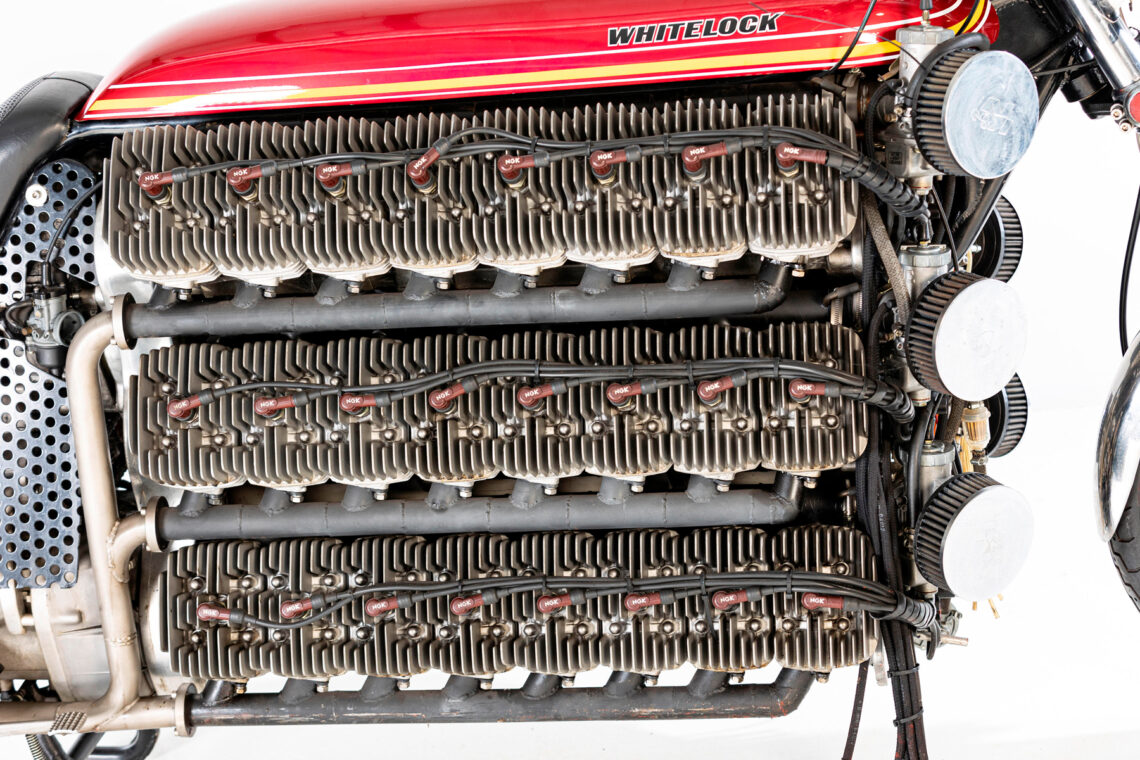 Pero la noticia no es esa. Se ha vuelta a hablar de esta monstruosa moto porque Bonhams Cars la ha anunciado en una de sus subastas. De hecho, han adjuntado nuevas fotos con mayor calidad y sigue sorprendiendo. Unas imágenes que resultan surrealistas cuando se ven la cantidad de cilindros en fila. En los tiempos que vivimos, cualquiera diría que ha sido creada o editada con IA, pero no, es real.