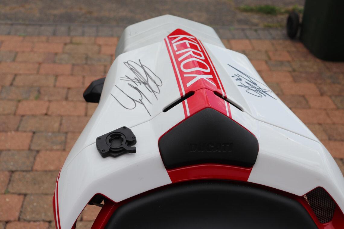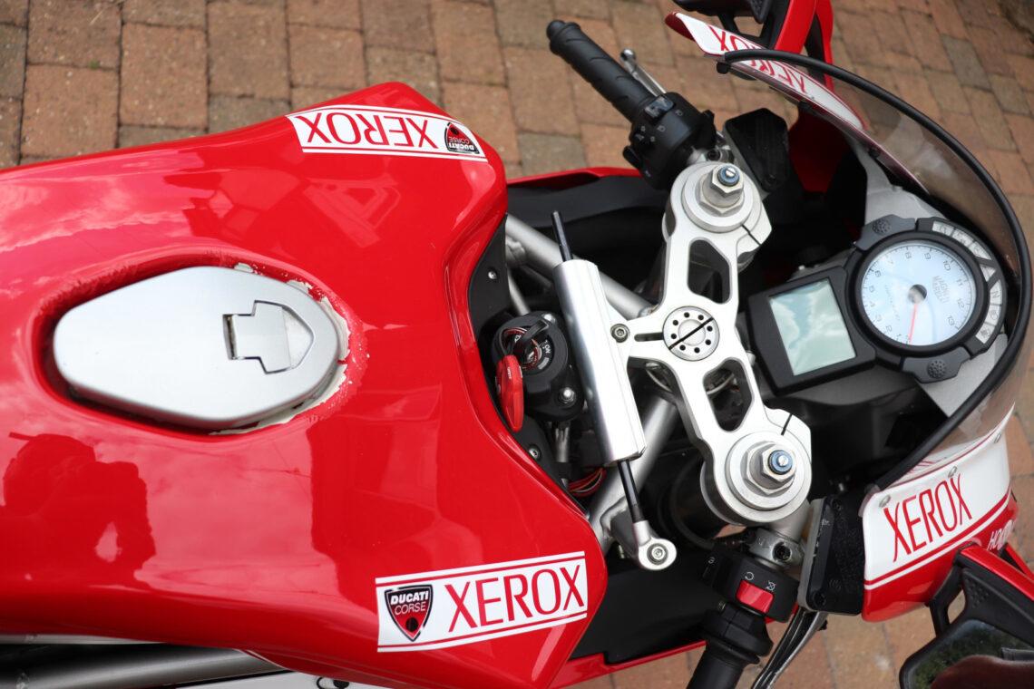 Aunque matriculada y apta para carretera, como cierre hemos querido añadir esta Ducati 749 S de 2006. Los mismos colores con los que Troy Bayliss arrasó y logró su segunda corona en el campeonato de motos de serie, aunque el australiano lo hizo con la mítica 999. Una moto que no tiene ni mil kilómetros, que comparte piezas de dicha 999 y contiene dos firmas en el colín que no se especifican en la descripción.