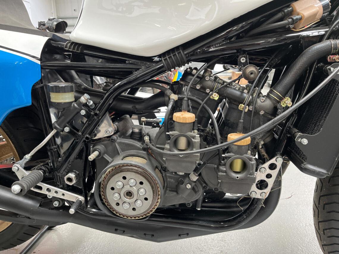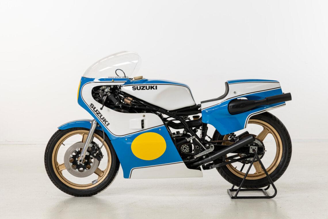 Esta preciosa Suzuki RG500 emula a la del Campeonato del Mundo en 1975, los mismos colores con los que Barry Sheene ganó sus primeras carreras en la categoría reina. Además de sus características y bonitas líneas, en su interior se encuentra un motor de cuatro cilindros colocados en cuadro, con la admisión por válvulas rotativas colocadas en los extremos de los cigüeñales. Sus escapes, dos saliendo hacia delante, y dos hacia atrás.