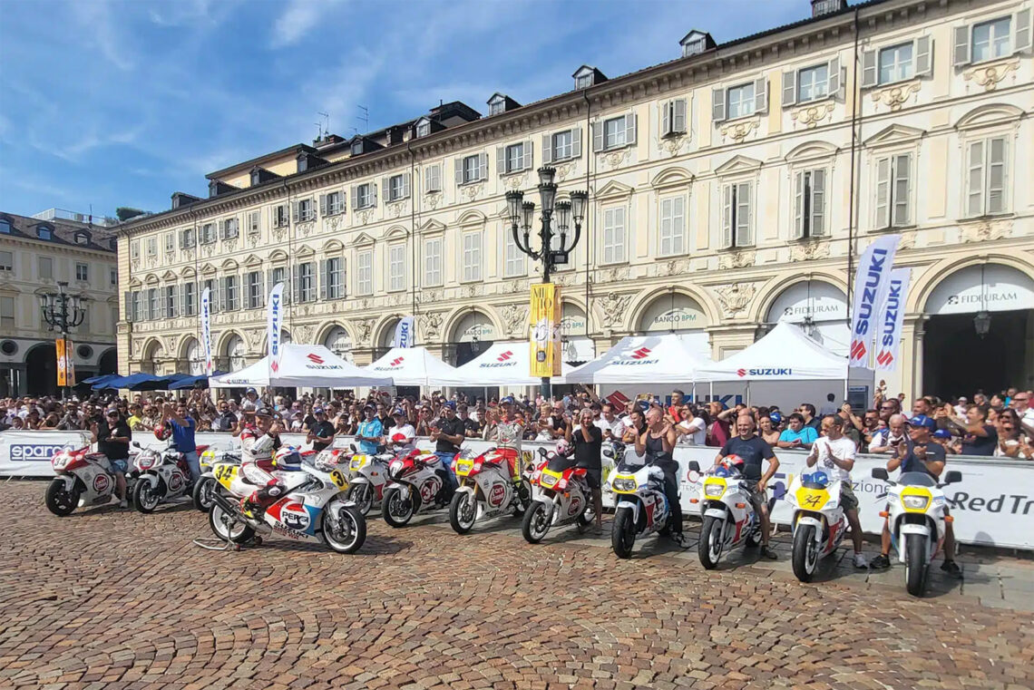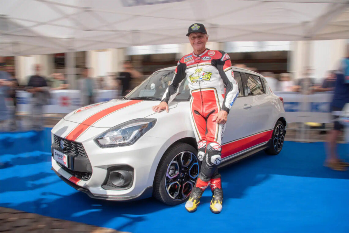 El evento de presentación tuvo lugar en la Autolook Week Torino, donde le vimos posar junto al Suzuki Swift y a su RGV-R 500 de años anteriores a su título, con la decoración Pepsi.