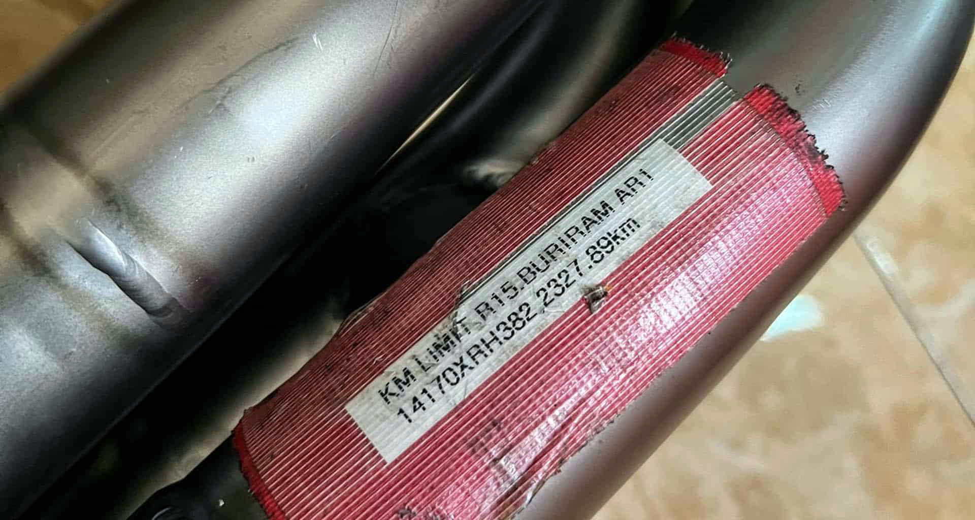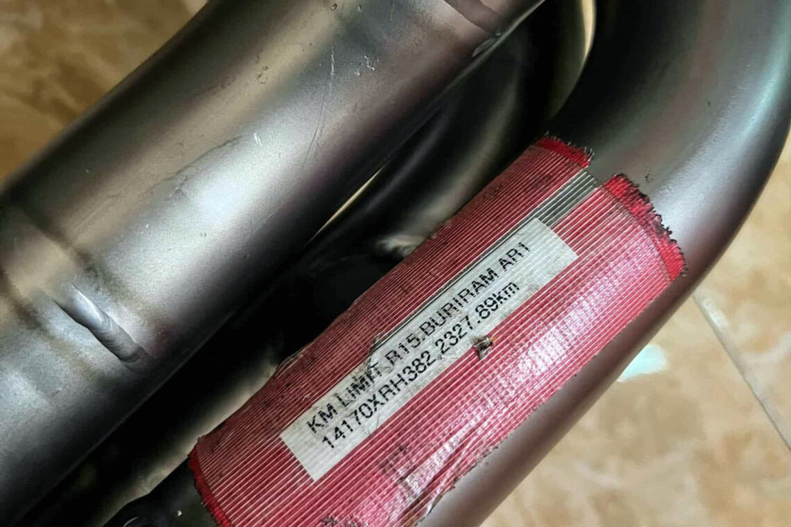 Ahora puedes hacerte no con una moto entera pero, sí de manera parcial o con algunos componentes. Esta unidad de Suzuki GSX-RR de motoGP es del año 2021, no sabemos si una moto oficial o de test, pero lo cierto es que tiene algunas etiquetas como la que vemos en el colector donde indica un uso de 2.327,89 kilómetros en el circuito de Buriram, Tailandia.