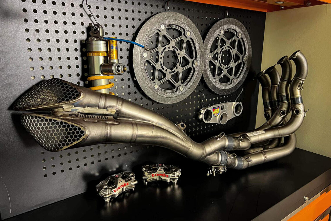 Curioso el caso de esta venta, que nos indica a pensar que se trata de alguna moto de test que se haya desechado y, este vendedor, de alguna forma u otra, haya logrado hacerse con estos descartes, ya que tiene más de un sistema de escape por ejemplo, o un sistema de batería de mariposas-aceleradores de Suzuki GSX-RR, además de componentes como decimos del Mundial de Superbike.