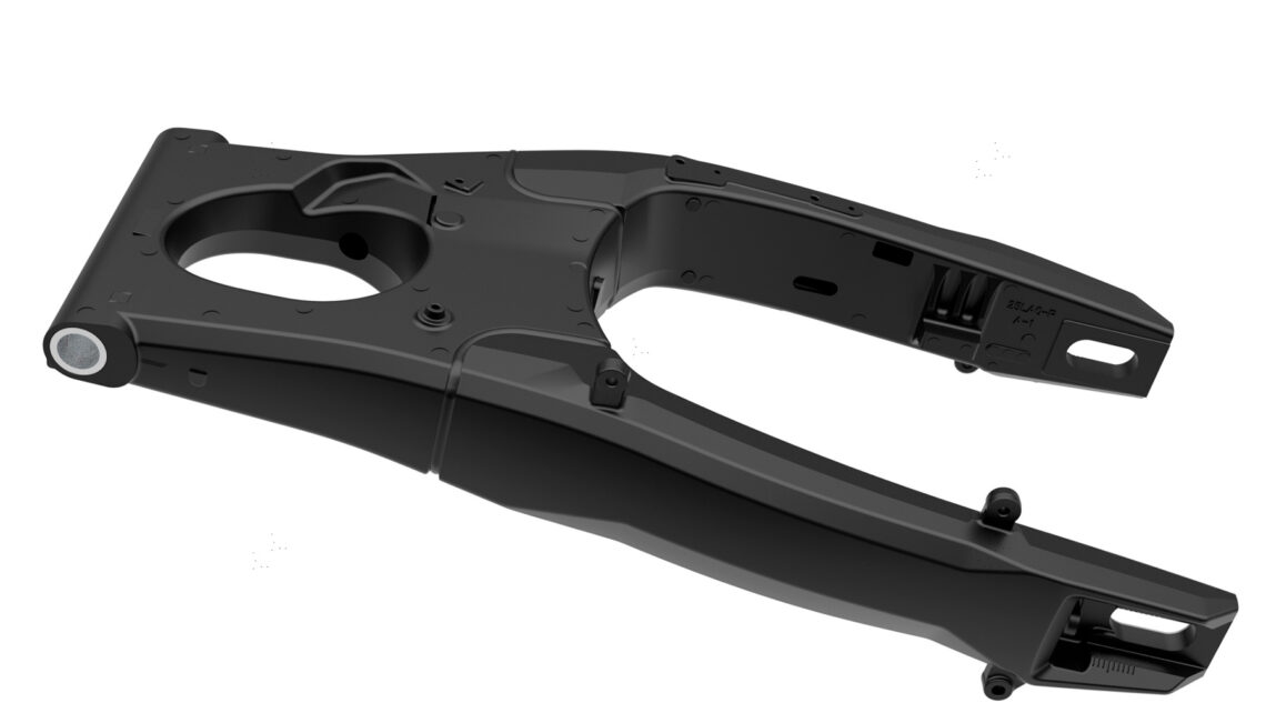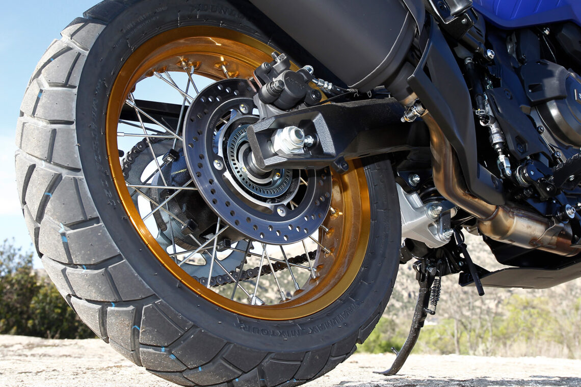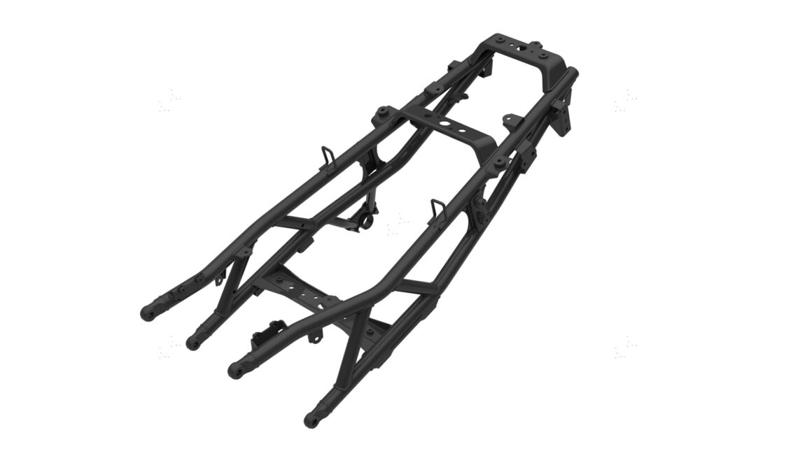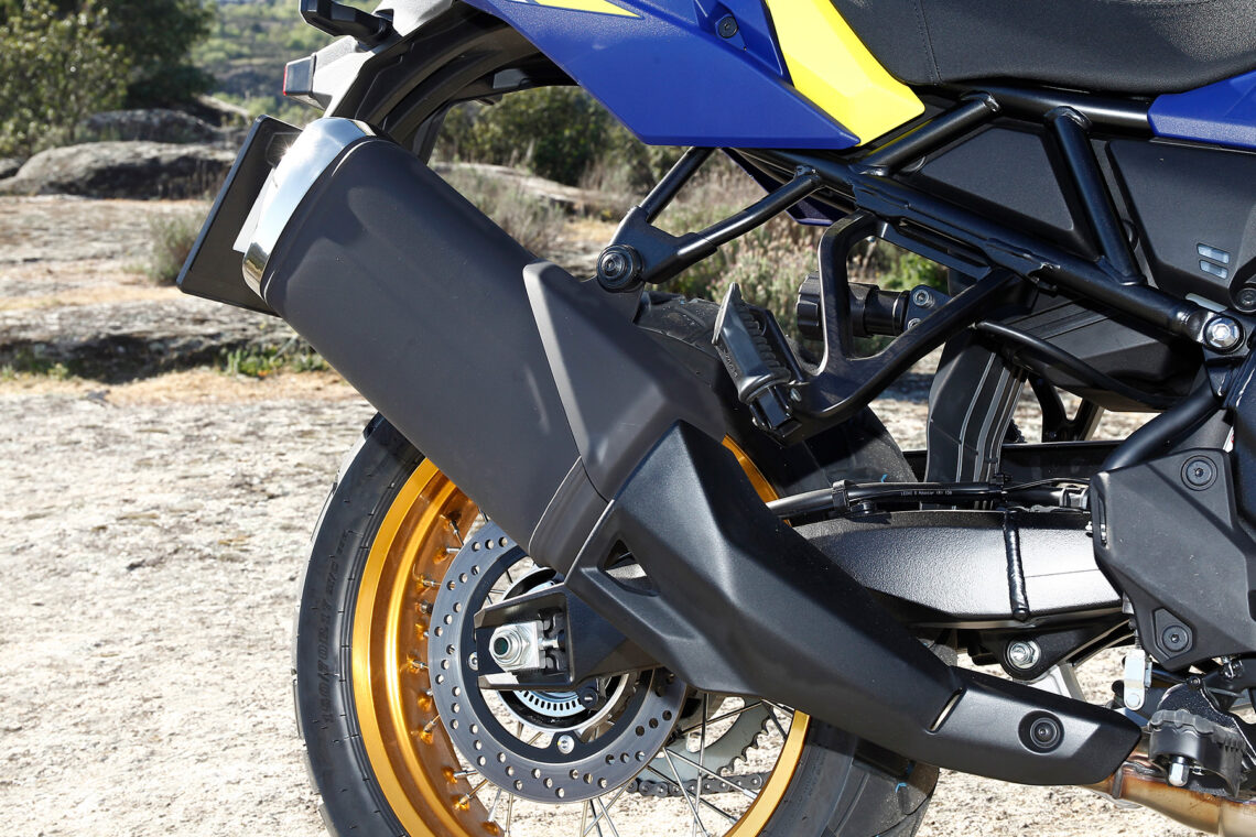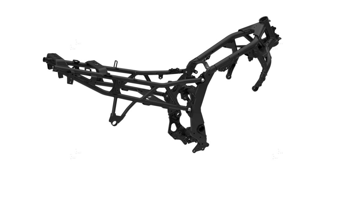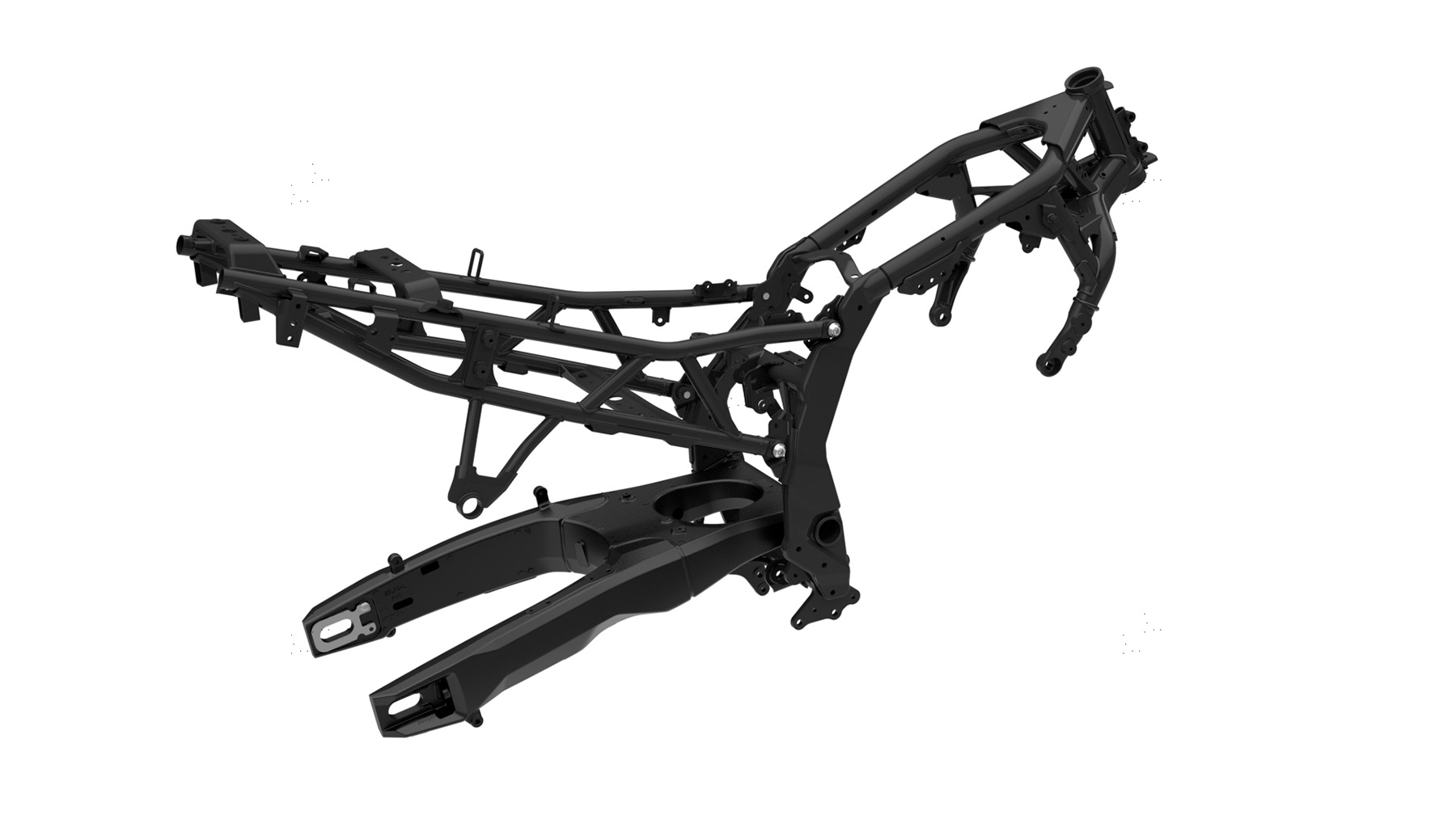 El chasis de la nueva V-Strom 800DE es un diseño tubular de acero, que se une a un basculante de aluminio.