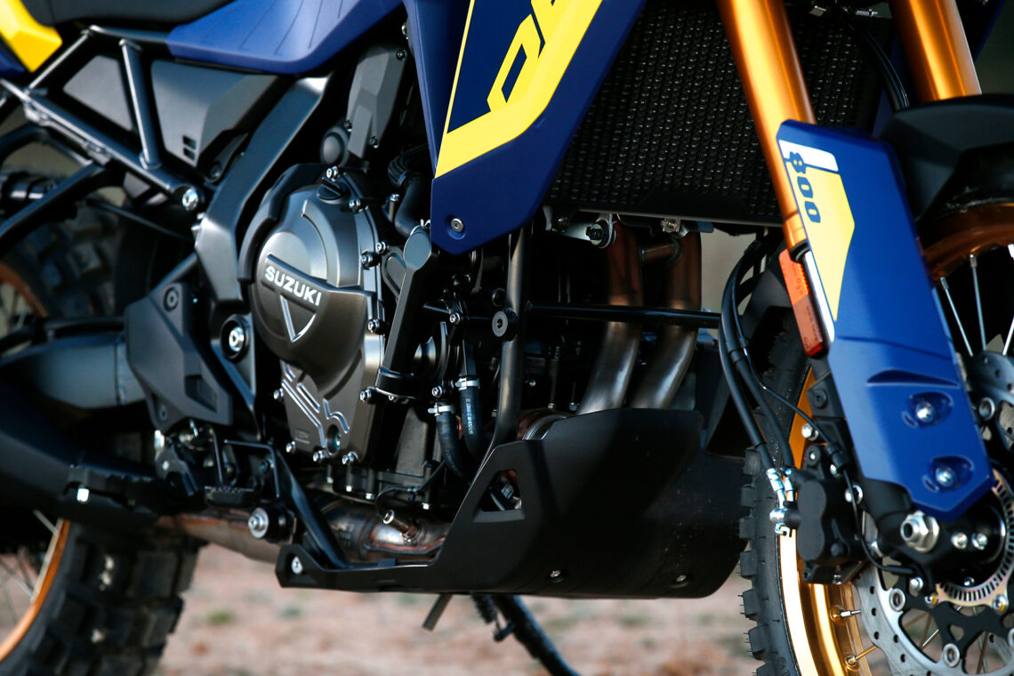 El chasis se nota algo rígido para la elasticidad que ofrecen por contraste las suspensiones, pero nada exagerado más allá de la mera reseña. Los frenos tienen buena mordida, pero no excepcional, van un poco acorde a la dualidad de uso de la V-Strom 800DE. Sin embargo en campo son perfectos, con la modulación adecuada y con un tacto exquisito, sobre todo en el tren trasero, el cual puede ir sin ABS.