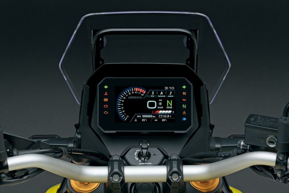 La electrónica es uno de los apartados más interesantes en esta Suzuki V-Strom 800DE, con un paquete sencillo pero muy bien preparado y acondicionado para el uso off-road. Cuenta con 3 modos de conducción (A, B, C), acelerador electrónico, control de tracción regulable en 4 niveles y desconectable, siendo uno de ellos un modo específico para uso en off-road denominado modo G, que tiene una interacción más rápida pero permisiva a la vez, permitiéndote ir gas a fondo derrapando sin interrumpir la entrega de par motor. También cuenta con ABS y regulable en 2 opciones, carretera y off-road donde se desconecta el ABS de la rueda trasera. A todo ello se suma los ya conocidos sistemas de ayuda propios de Suzuki como son el Suzuki Easy Start y el Low RPM Assistant.