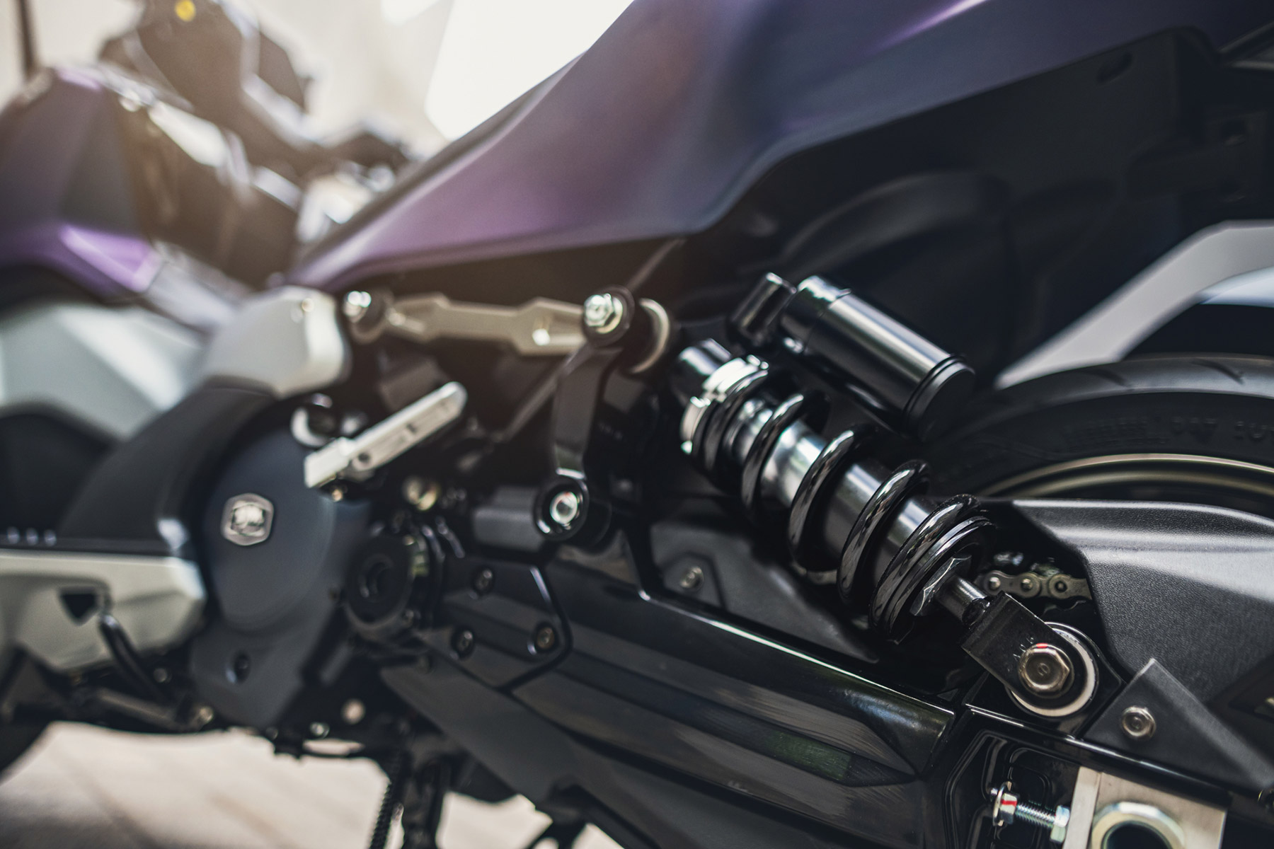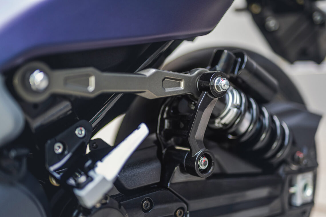 Dejando claro que es un scooter, el concepto "suspensiones de moto" viene por el diseño del tren delantero, el cual cuenta con anclaje de doble tija. Esta solución estructural es propio de motos de alta cilindrada, ya que confiere un extra de solidez y rigidez al tren delantero así como una sensación mejor sobre todo lo que está ocurriendo entre el suelo y tus manos, ofreciendo mucha más información. Por no decir que se trata de una horquilla invertida de 41 mm de diámetro, como el que encontramos en motos deportivas.