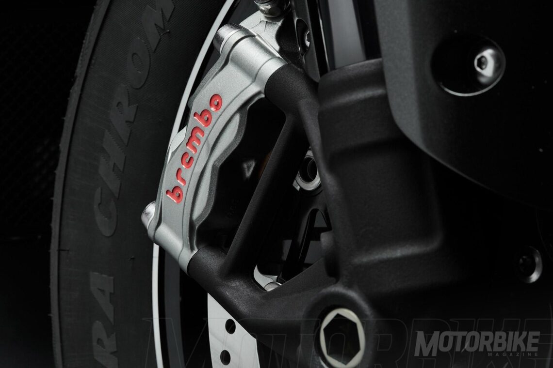 Como puedes imaginarte, la 'canela fina' está por todas partes. Escapes Arrow con silenciador en fibra de carbono, mismo material que salpica el resto de la Triumph Rocket 3 TFC por diversas zonas, suspensiones regulables Showa, pinzas monobloque Brembo Stylema (tope de gama), pinza de freno radial Brembo y manetas de freno y embrague ajustables Brembo MCS, un espectacular diseño de color bitono y unas líneas que saben mezclar la personalidad arrolladora con líneas minimalistas y modernas, además de detalles actuales como las luces LED o el tremendo neumático trasero de 240 mm.