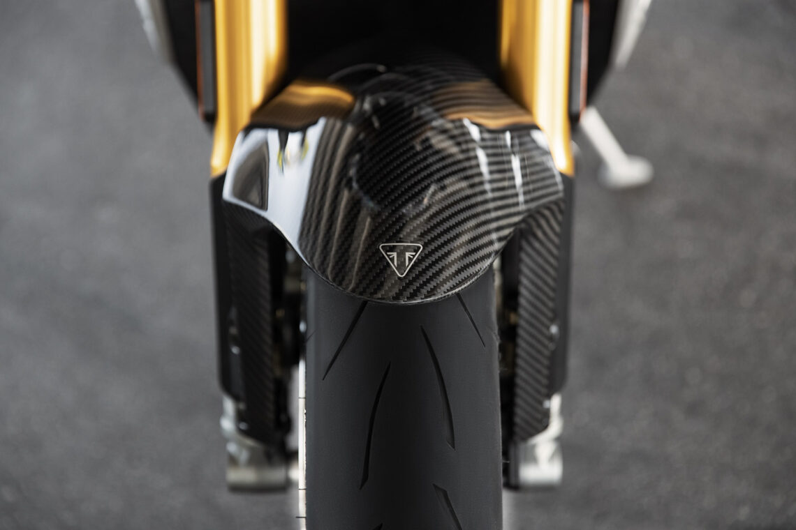 En cuanto a los neumáticos, la Speed Triple 1200 RS viene equipada de serie con Metzeler Racetec K3 RR en medidas: