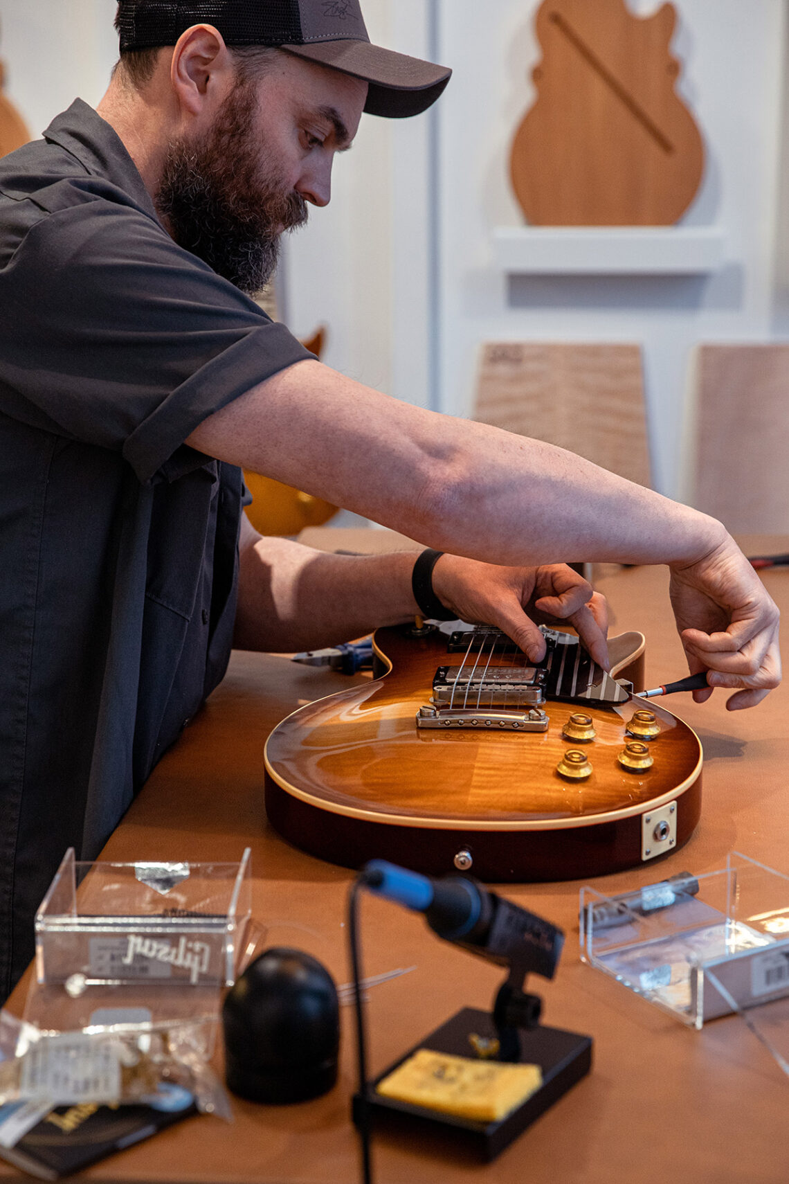 - Tapón de llenado de combustible grabado con láser con el logotipo de Gibson.